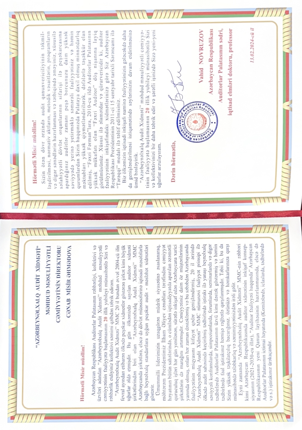 Azərbaycan Respublikası Auditorlar Palatasının sədri, iqtisad elmləri doktoru, professor Vahid Novruzov “Azərbeynəlxalq audit xidməti” MMC-nin kollektivini 20 illik yubileyi münasibəti ilə təbrik etmişdir.