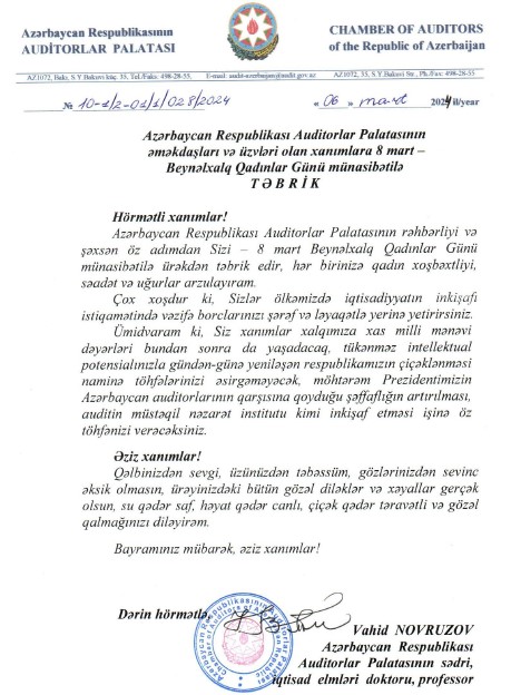 Auditorlar Palatasının sədri, iqtisad elmləri doktoru, professor Vahid Novruzov Auditorlar Palatasının üzvləri olan xanım auditorlara 8 mart - Beynəlxalq Qadınlar günü münasibətilə təbrik məktubu ünvanlamışdır