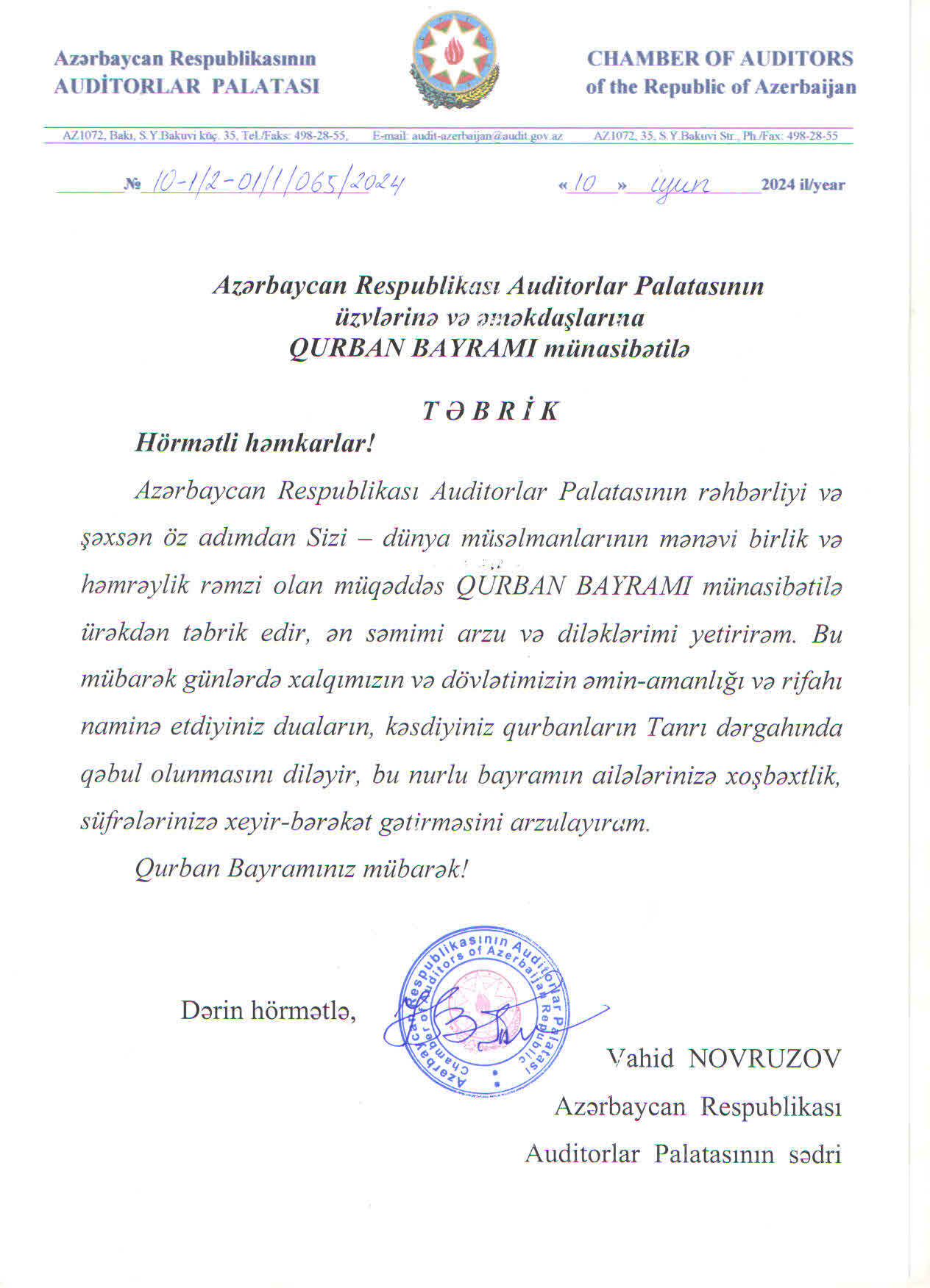 Azərbaycan Respublikası Auditorlar Palatasının sədri, iqtisad elmləri doktoru, professor Vahid Novruzov "Qurban Bayramı" münasibətilə Azərbaycan Respublikası Auditorlar Palatasının üzvlərinə təbrik məktubu ünvanlamışdır.