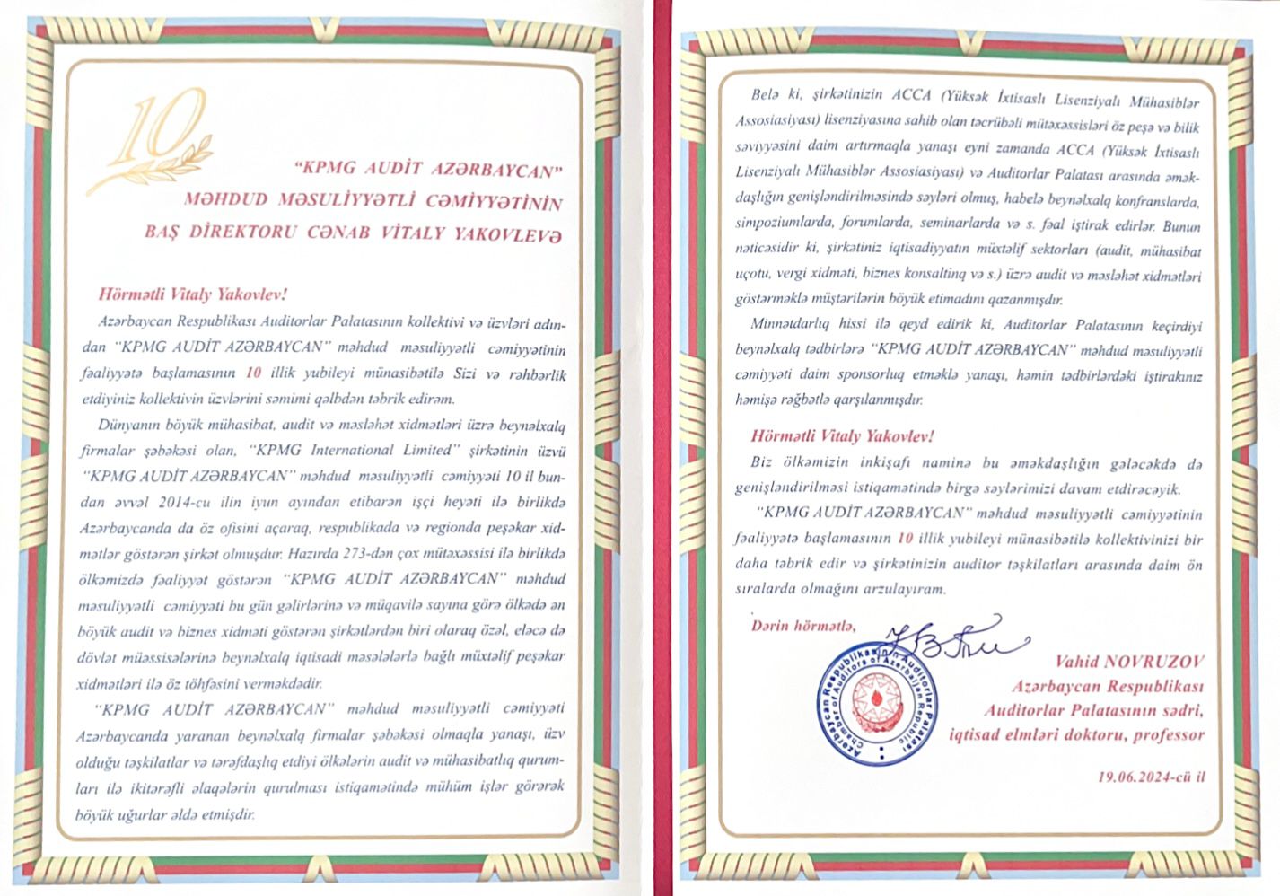 Azərbaycan Respublikası Auditorlar Palatasının sədri, iqtisad elmləri doktoru, professor Vahid Novruzov “KPMG AUDİT AZƏRBAYCAN” MMC-nin kollektivini 10 illik yubileyi münasibəti ilə təbrik etmişdir.