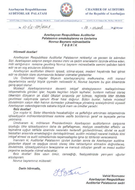Azərbaycan Respublikası Auditorlar Palatasının sədri, iqtisad elmləri doktoru, professor Vahid Novruzov "Novruz Bayramı" münasibətilə Auditorlar Palatasının əməkdaşlarına və üzvlərinə təbrik məktubu ünvanlamışdır.
