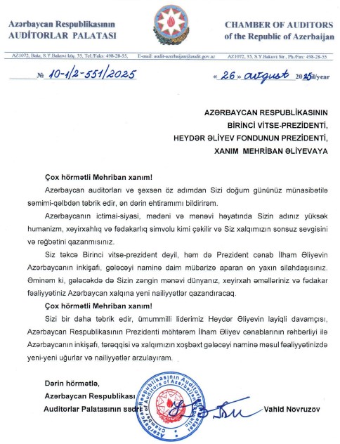 Azərbaycan Respublikası Auditorlar Palatasının sədri Vahid Novruzov Azərbaycan Respublikasının Birinci vitse-prezidenti, Heydər Əliyev Fondunun prezidenti, xanım Mehriban Əliyevaya ad günü münasibətilə teleqram ünvanlamışdır.