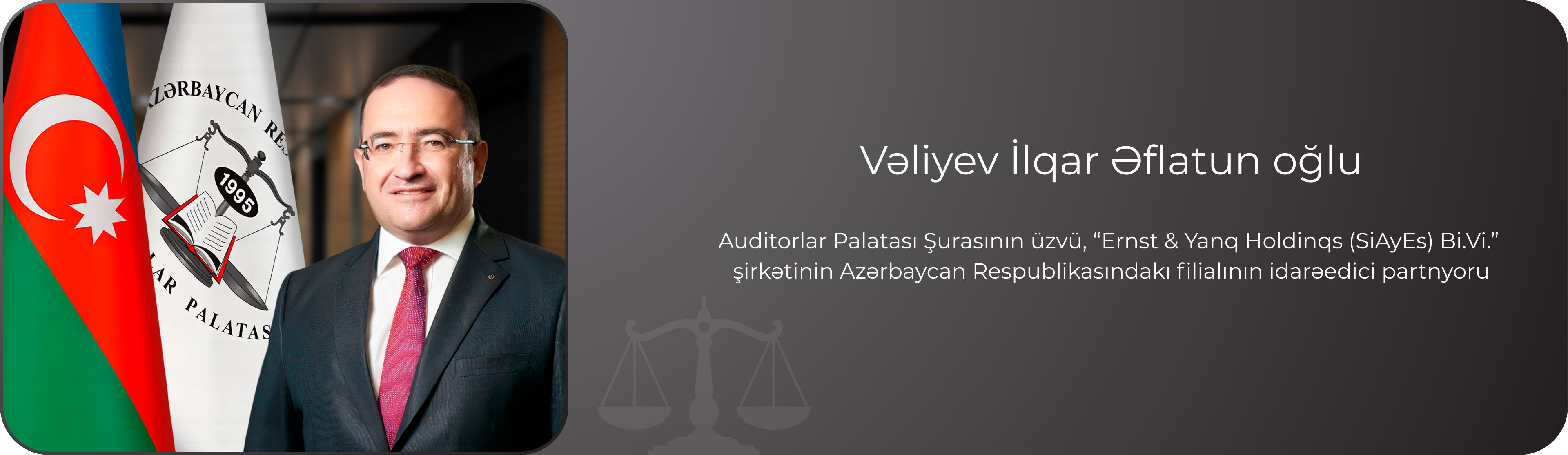 İlqar Vəliyev Diplomlu Mühasib, Amerika Diplomlu Mühasiblər İnstitutu (ABŞ) və Azərbaycan Respublikasının Auditorlar Palatasının lisenziyalı auditorudur, audit şirkətlərində iş stajı 18 ilə bərabərdir.