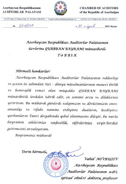 Azərbaycan Respublikası Auditorlar Palatasının sədri, iqtisad elmləri doktoru, professor Vahid Novruzov "Qurban Bayramı" münasibətilə Azərbaycan Respublikası Auditorlar Palatasının üzvlərinə təbrik məktubu ünvanlamışdır.
