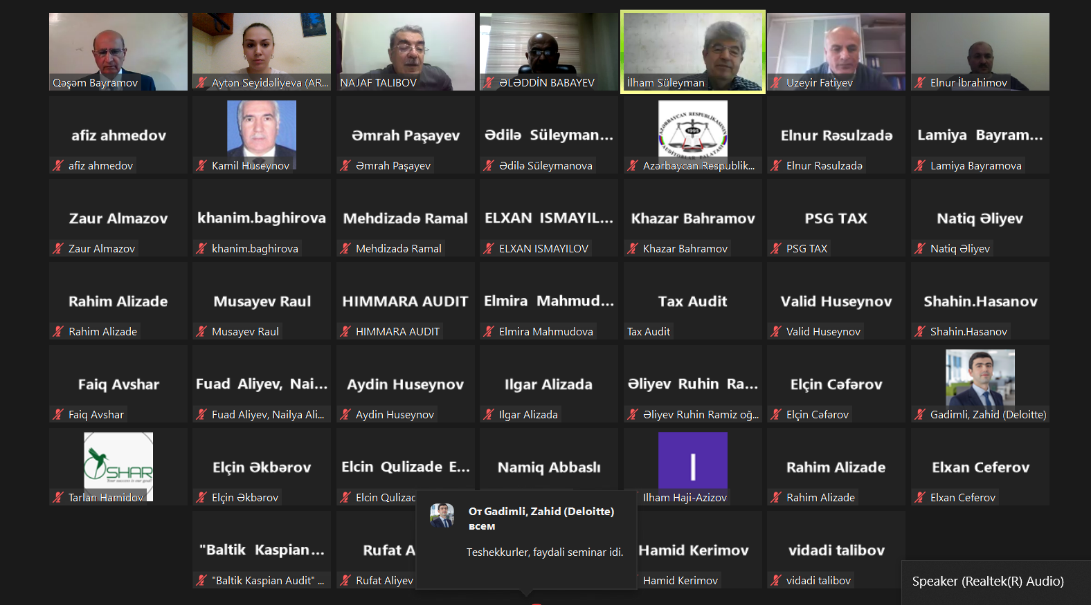 Azərbaycan Respublikası Auditorlar Palatasının sədri cənab Vahid Novruzovun 2021-ci ilin 30 dekabr tarixində təsdiq etdiyi «Azərbaycan Respublikasının Auditorlar Palatası tərəfindən 2022-ci ildə keçirilməsi nəzərdə tutulan tədbirlərin (konfranslar, simpoziumlar, «dəyirmi masa»lar, seminarlar, ustad dərsləri və s.) aylar üzrə Qrafik”inə uyğun olaraq 2022-ci ilin 14 yanvar tarixində saat 10.00-da onlayn qaydada Auditorlar Palatasının üzvləri üçün «Korrupsiya, PL/TM-ə qarşı mübarizə və kölgə iqtisadiyyatının azaldılması ilə bağlı Peşəkar Mühasiblərin Beynəlxalq Etika Məcəlləsinin (Beynəlxalq Müstəqillik Standartları ilə birlikdə) müddəalarında nəzərdə tutulmuş auditorların öhdəliklərinin şərhi» mövzusunda seminar keçirildi (Moderator: Qəşəm Bayramov – Aparatın rəhbəri, məruzəçilər: Nəcəf Talıbov – sədrin elmi-metodik məsələlər üzrə müşaviri, Elm, innovasiyaların tətbiqi və auditor fəaliyyətinin metodoloji təminatı üzrə komitənin sədri, Üzeyir Fətiyev – sərbəst auditor, haqsız rəqabətə və dempinqə qarşı mübarizə üzrə komitənin sədri).