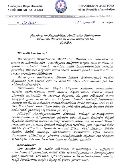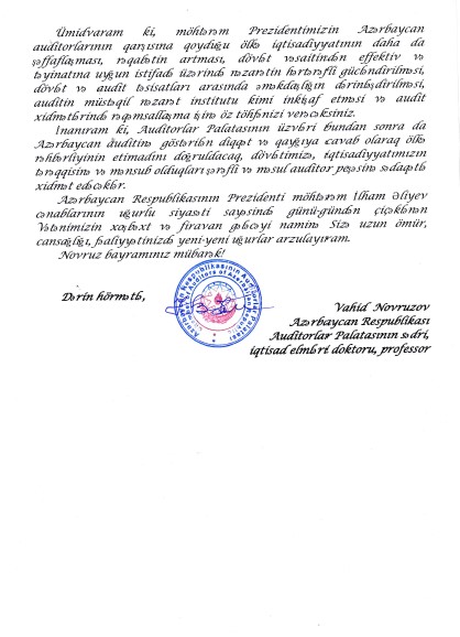 Auditorlar Palatasının sədri, iqtisad elmləri doktoru, professor Vahid Novruzov Auditorlar Palatasının üzvlərinə Novruz bayramı münasibətilə təbrik məktubu ünvanlamışdır.