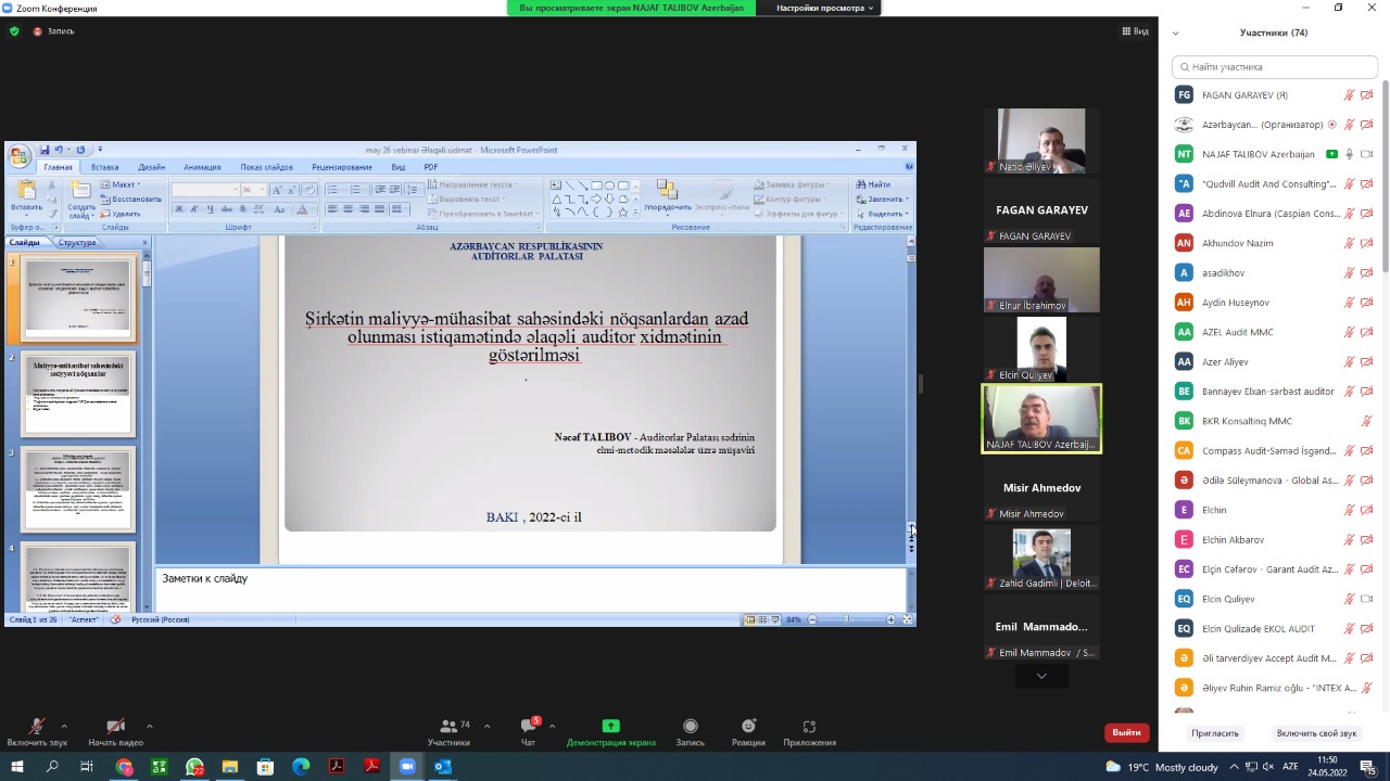 2022-ci ilin 24 may tarixində “Korrupsiya hüquq pozmalarının aşkar edilməsində və profilaktikasında auditorların yol verdikləri tipik təşkilati və prosedur səhvlərin şərhi” (moderator – Palata sədrinin elmi-metodik məsələlər üzrə müşaviri Nəcəf Talıbov, məruzəçi – Auditin hüquqi tənzimlənməsi və dövlət orqanları ilə iş idarəsinin rəisi, sərbəst auditor Elnur İbrahimov) və “Şirkətin maliyyə-mühasibat sahəsindəki nöqsanlardan azad olunması istiqamətində əlaqəli auditor xidmətinin göstərilməsi” (məruzəçi – Palata sədrinin elmi-metodik məsələlər üzrə müşaviri Nəcəf Talıbov) mövzularında seminar keçirildi.