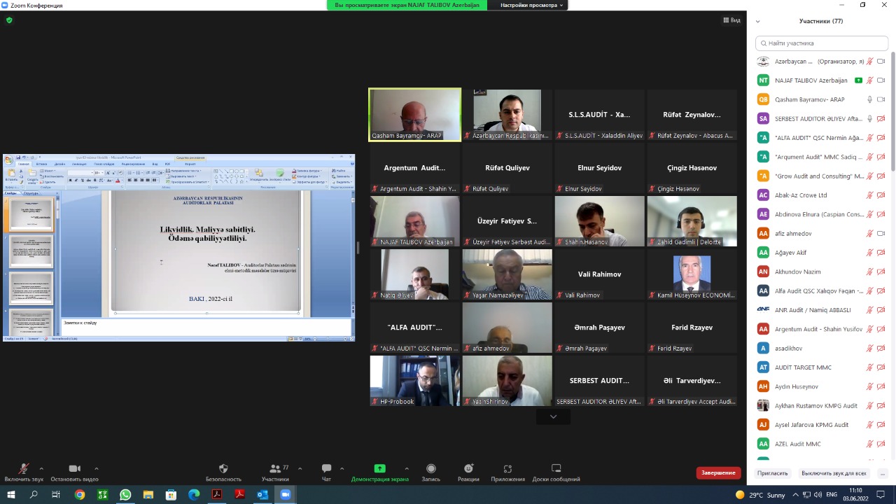 2022-ci il 03 iyun tarixində “İqtisadi subyektin maliyyə sabitliyi, ödəmə qabiliyyətliyi likvidliyi” mövzusunda seminar və “Auditdə psixoloji məqamlar” mövzusunda “ustad dərsi” keçirilmişdir