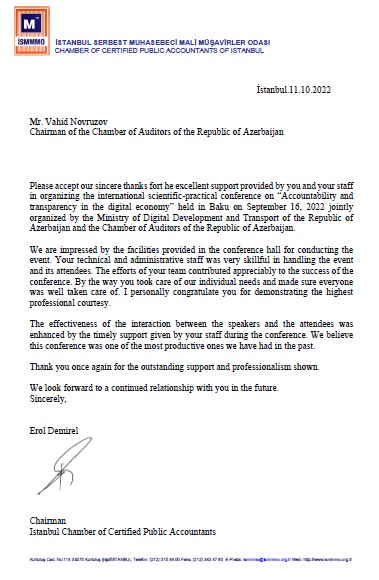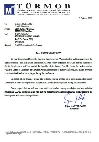 Türkiyə Sertifikatlı Mühasiblər Palataları Birliyinin (TÜRMOB) sədri Emre Kartaloğlu və İstanbul Sertifikatlı İctimai Mühasiblər Palatasının (İSMMMO) sədri Erol Demirel tərəfindən Azərbaycan Respublikası Auditorlar Palatasına məktub ünvanlanmışdır.