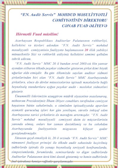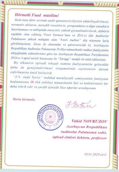 Azərbaycan Respublikası Auditorlar Palatasının sədri, iqtisad elmləri doktoru, professor Vahid Novruzov "F.N AUDIT SERVİS" MMC-nin kollektivini 20 illik yubileyi münasibəti ilə təbrik etmişdir.
