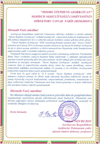 Azərbaycan Respublikası Auditorlar Palatasının sədri, iqtisad elmləri doktoru, professor Vahid Novruzov “Moore Stephens Azerbaijan” MMC-nin kollektivini 10 illik yubileyi münasibəti ilə təbrik etmişdir.