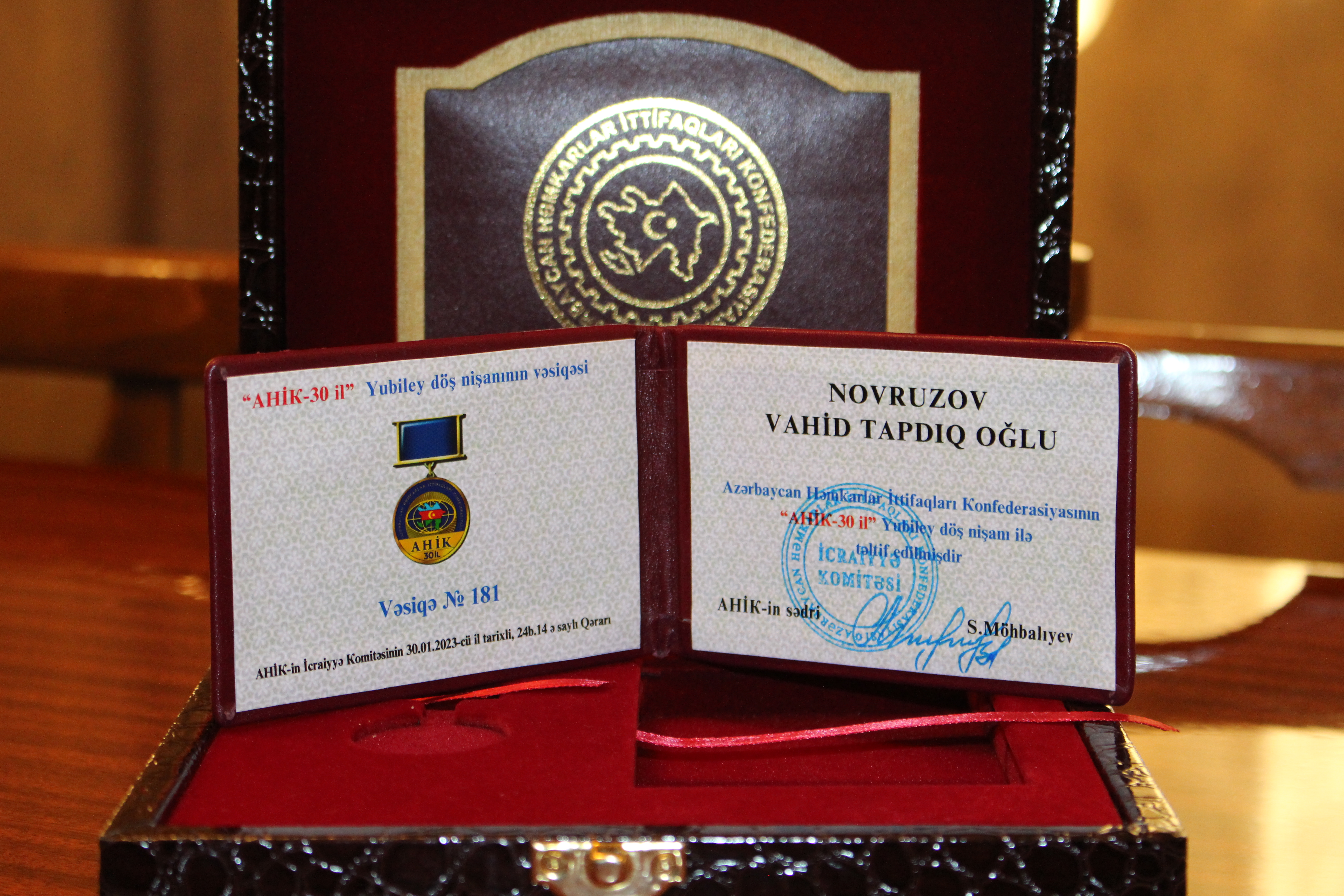 Azərbaycan həmkarlar ittifaqlarının cəmiyyətdəki mövqeyinin möhkəmləndirilməsində ardıcıl həyata keçirdiyi siyasətini, işçilərin sosial-iqtisadi hüquqlarının müdafiəsi, işçilərin sosial problemlərinin həlli istiqamətindəki prinsipial və qətiyyətli mövqeyini nəzərə alaraq AHİK-in İcraiyyə Komitəsinin 2023-cü il 30 yanvar tarixli 24b.14ə saylı qərarı ilə Azərbaycan Respublikası Auditorlar Palatasının sədri, iqtisad elmləri doktoru, professor Novruzov Vahid Tapdıq oğlu Azərbaycan Həmkarlar İttifaqları Konfederasiyasının “AHİK-30 il” yubiley döş nişanı ilə təltif edilmişdir.