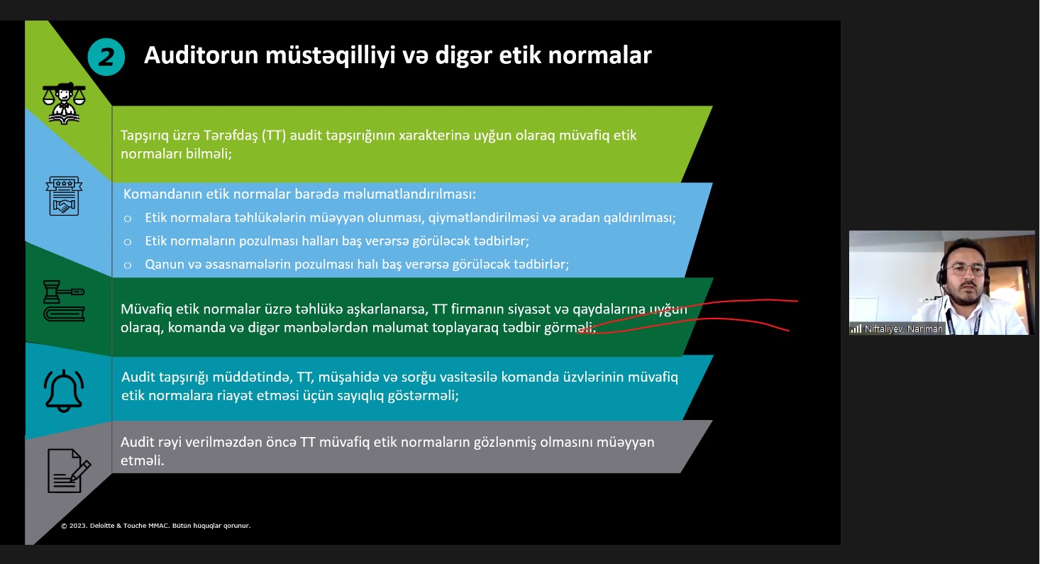 Q.Bayramov ustad dərsi haqqında geniş məlumat verdikdən sonra sözü “Deloitte &Touche” Məhdud Məsuliyyətli Auditor Cəmiyyətinin Audit üzrə meneceri Nəriman Niftəliyevə verdi.