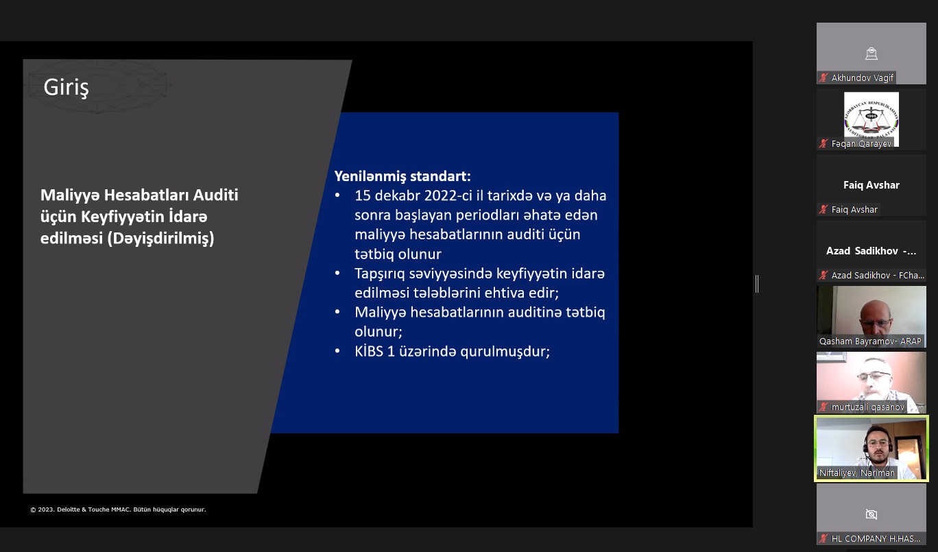 Auditorlar Palatasında 2023-cü ilin 19 iyul tarixində “220 saylı BAS: Maliyyə hesabatlarının auditinin keyfiyyətinə nəzarət” (moderator – Aparatın rəhbəri Qəşəm Bayramov; məruzəçi – “Deloitte &Touche” Məhdud Məsuliyyətli Auditor Cəmiyyətinin Audit üzrə meneceri Nəriman Niftəliyev) mövzusunda ustad dərsi keçirildi.