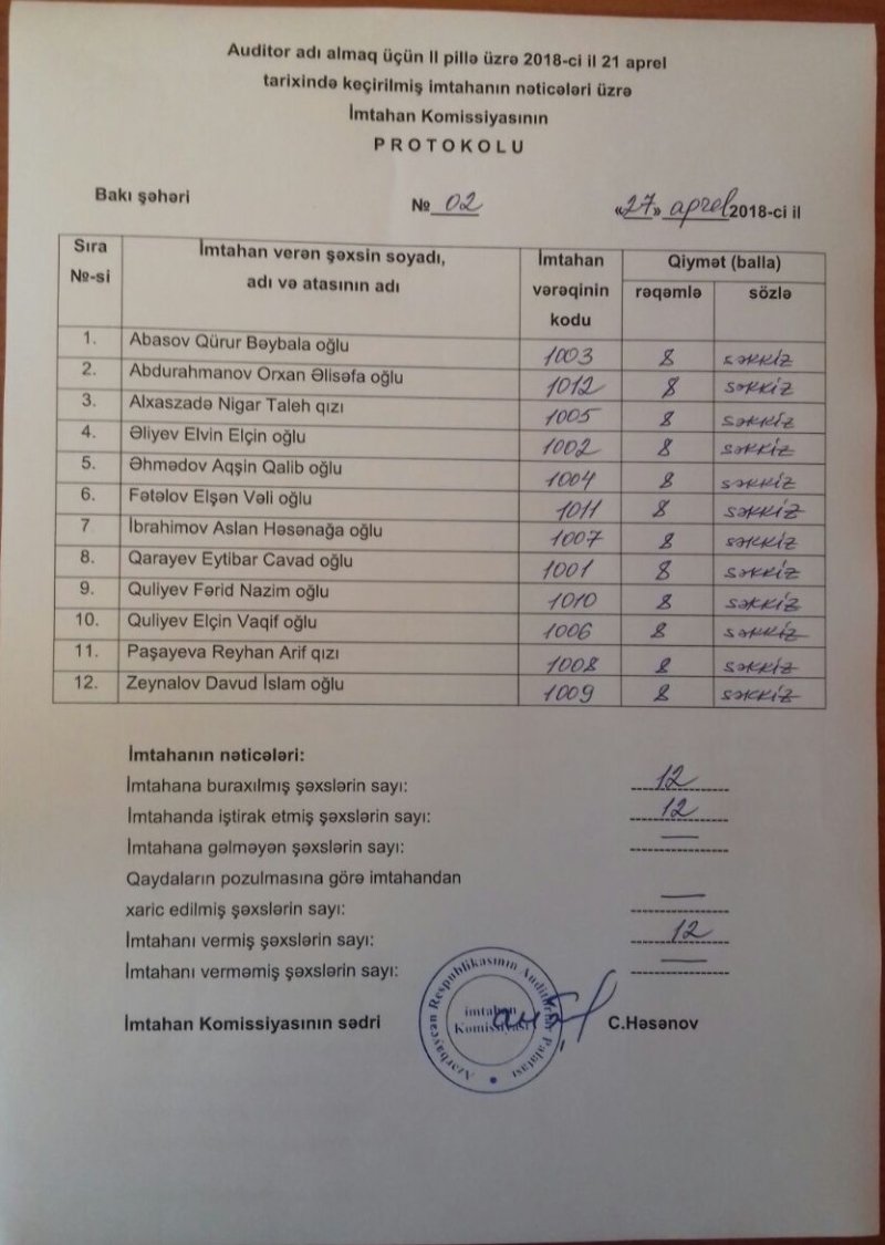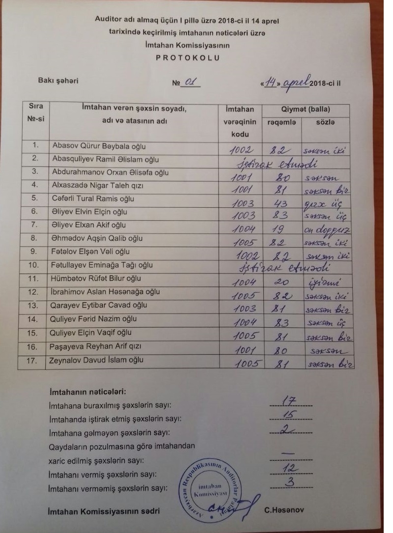 Auditor adı almaq üçün 2018-ci il 14 -21 aprel tarixlərində keçirilmiş I və II pillə üzrə imtahanın nəticələri