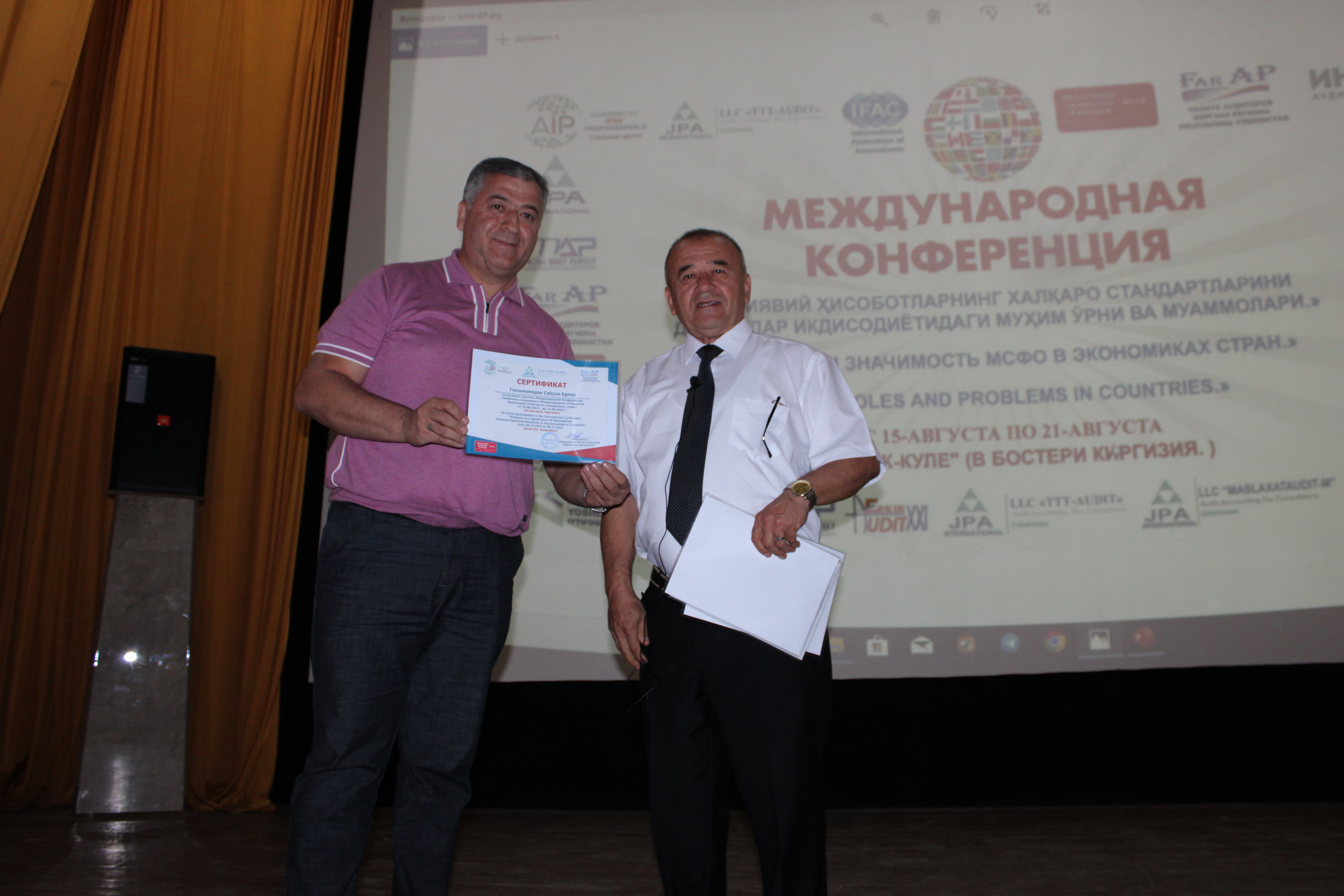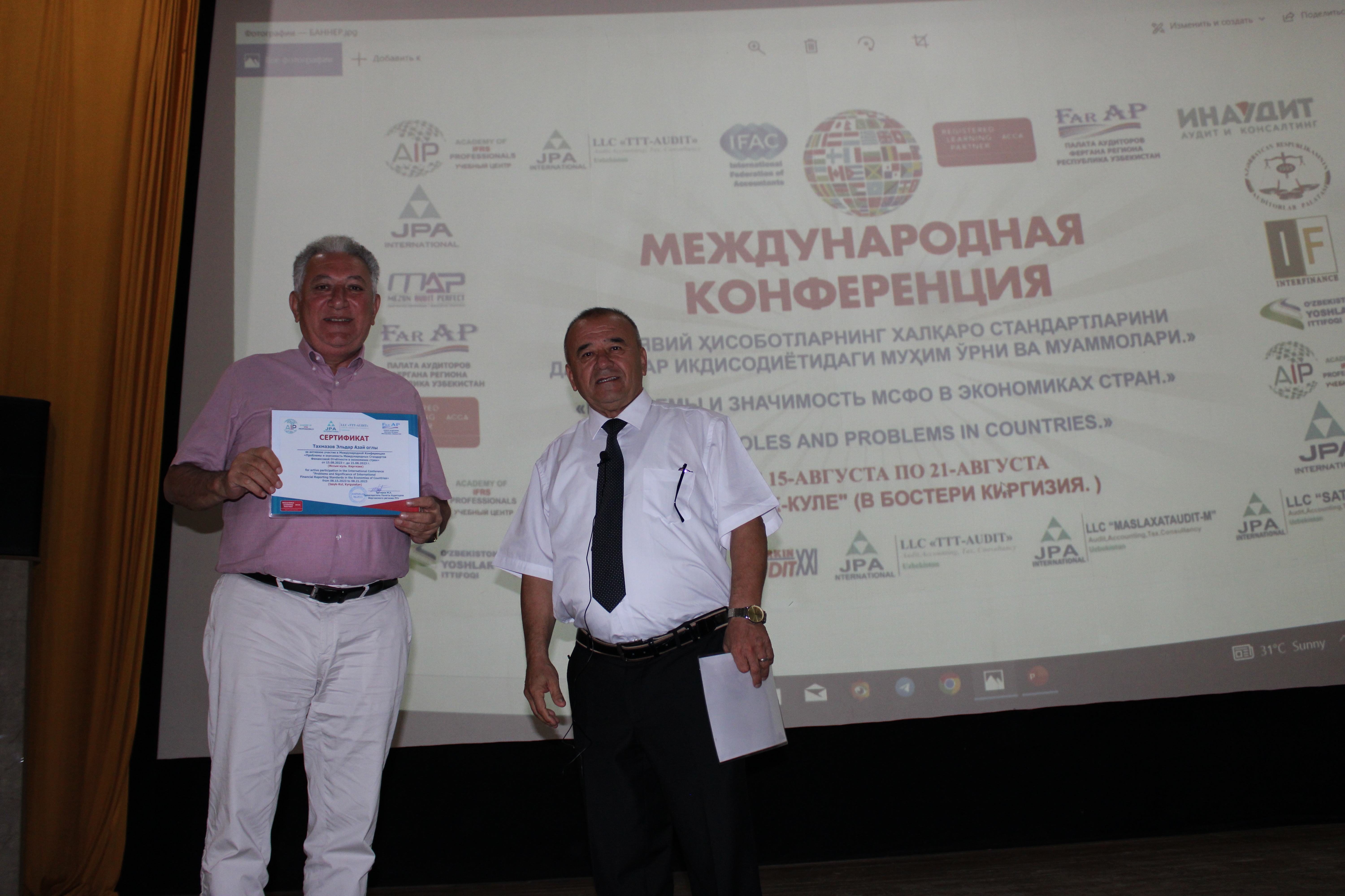 Azərbaycan Respublikasının Prezidenti İlham Əliyev cənablarının proqram xarakterli göstərişlərini rəhbər tutaraq, müstəqil maliyyə nəzarəti sahəsində mütərəqqi dünya təcrübəsini öyrənmək və milli iqtisadiyyatın xüsusiyyətləri nəzərə alınmaqla ölkəmizdə tətbiqini genişləndirmək və beynəlxalq təcrübədən daha səmərəli bəhrələnmək məqsədilə, Özbəkistan Respublikası Fərqanə regionu Auditorlar Palatası tərəfindən 15.08.2023-21.08.2023-cü il tarixlərində Qırğızıstan Respublikasının Çolpan-Ata (İssık-Kul) şəhərində “Beynəlxalq Audit və Maliyyə Hesabatları Standartlarının tətbiqi”nə həsr olunmuş beynəlxalq konfransda Azərbaycan Respublikası Auditorlar Palatasının nümayəndə heyətləri: Auditorlar Palatasının icraçı direktoru Səbuhi Gülməmmədov və Palatanın üzvü, “Azəruçot” MMC-nin direktoru Eldar Təhməzov iştirak edib.