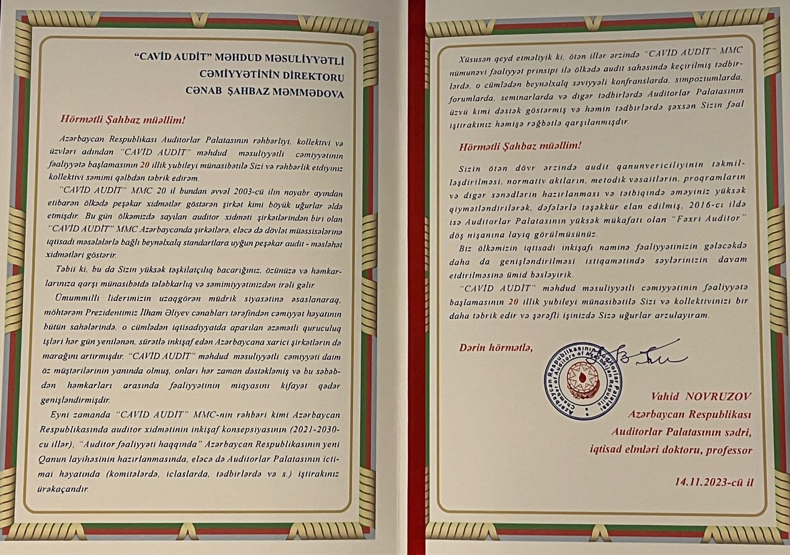 Azərbaycan Respublikası Auditorlar Palatasının sədri, iqtisad elmləri doktoru, professor Vahid Novruzov "CAVİD AUDİT" MMC-nin kollektivini 20 illik yubileyi münasibəti ilə təbrik etmişdir.