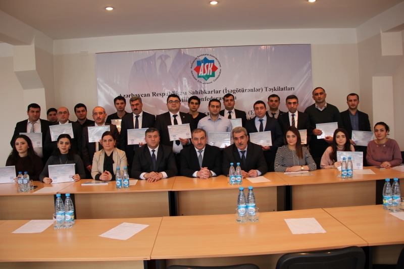 Təlimdə Azərbaycan Respublikası Sahibkarlar (İşəgötürənlər) Təşkilatları Milli Konfederasiyasını, “Azərsun” Holdinqi, “Aqrarkredit” Səhmdar Kredit Təşkilatını, “Turanbank” ASC-ni, “NABUCCO A&C” MMC-ni, “Green Tech" MMC-ni, “İnter-Tobacco” MMC-ni, “CN Co.LTD” şirkətini, Bioloji Təbabət Klinikasını, Şamaxı Müalicə Diaqnostika Mərkəzini, İqtisadi Araşdırmalar və Tədris Mərkəzi, “Azərbaycan İnşurans Brokinq” Sığorta Şirkətini, Bakı Nəqliyyat Departamentini, “Təmiz Qaz” MMC-ni, “Modern Group of Companies” MMC-ni təmsil edən 23 nəfər nümayəndələri iştirak etmişdir. 2018-ci il 24 yanvar tarixində Azərbaycan Respublikası Sahibkarlar (İşəgötürənlər) Təşkilatları Milli Konfederasiyasında təlimdə iştirak edən şəxslərə sertifikatların təqdim edilməsi mərasimi keçirildi.
