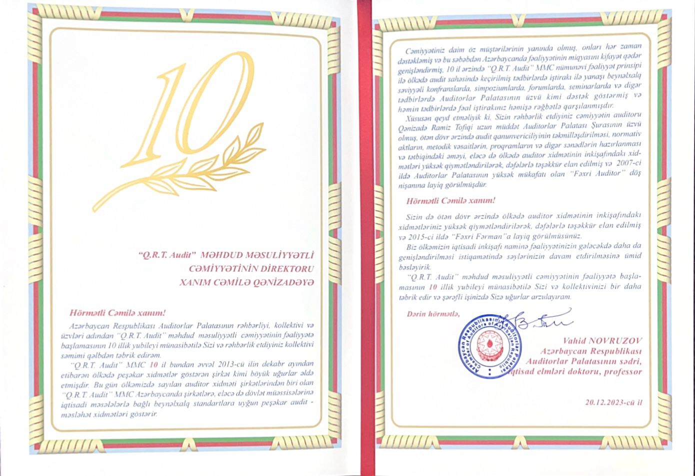 Azərbaycan Respublikası Auditorlar Palatasının sədri, iqtisad elmləri doktoru, professor Vahid Novruzov "Q.R.T" MMC-nin kollektivini 10 illik yubileyi münasibəti ilə təbrik etmişdir.