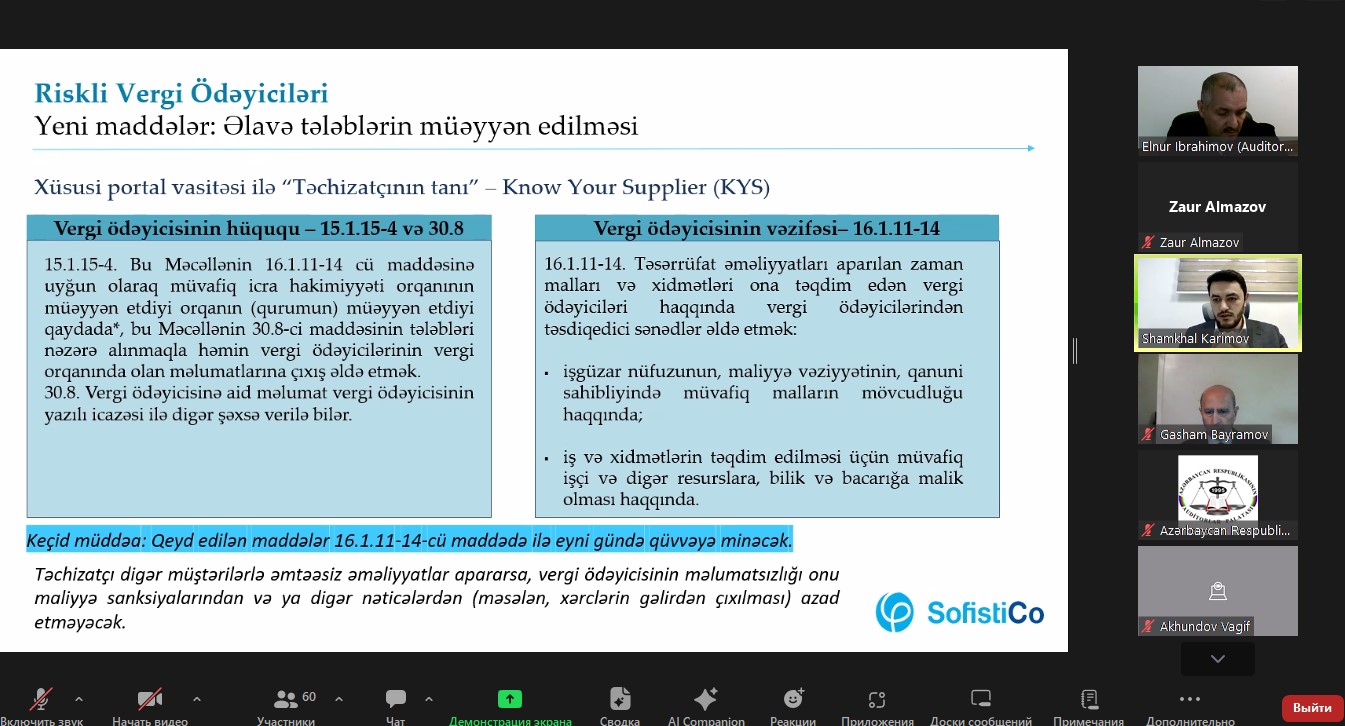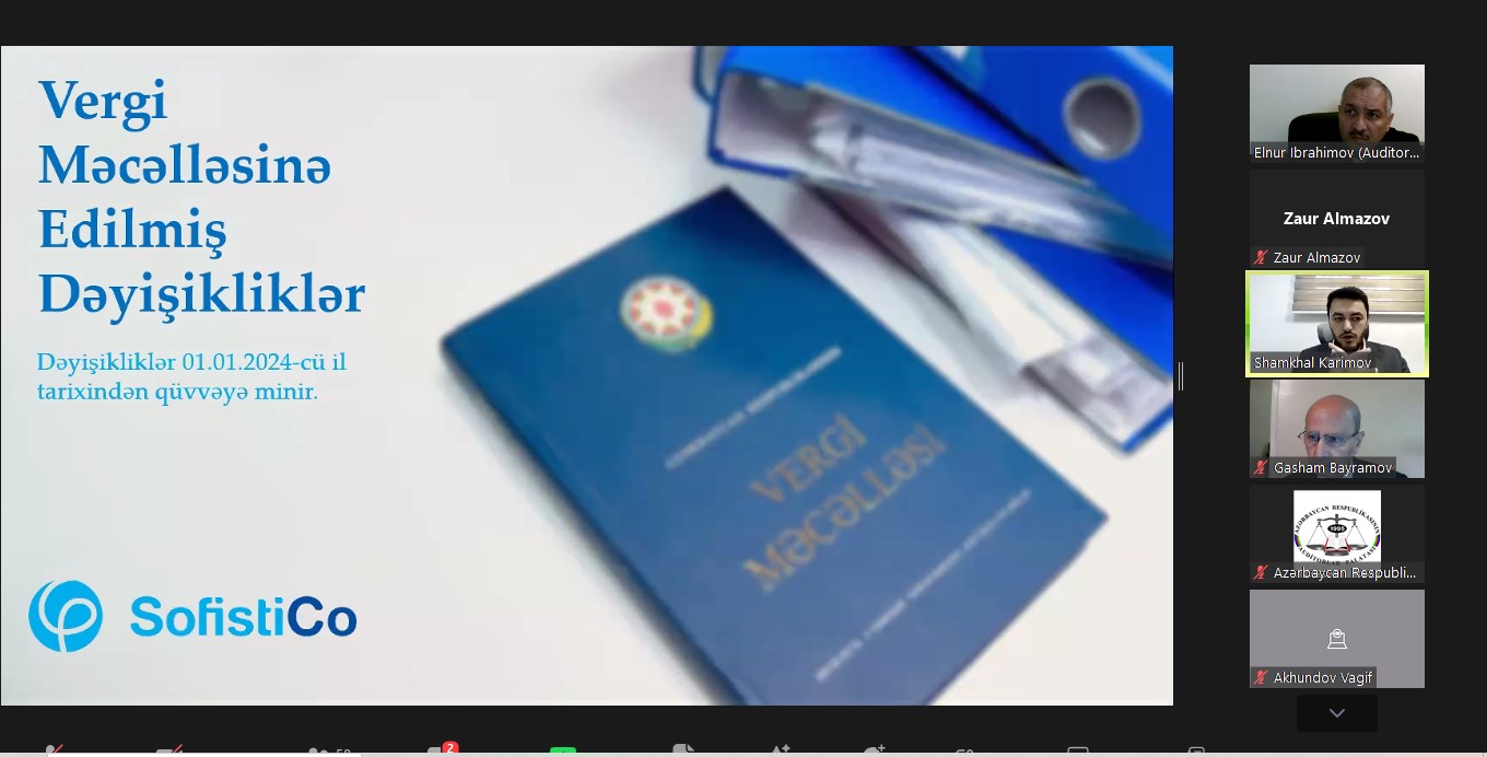 Moderator Qəşəm Bayramov dinləyicilər qismində iştirak edən Auditorlar Palatasının əməkdaşlarını üzvlərini salamlayaraq “Vergi məcəlləsinin və Maliyyə Hesabatlarının praktiki tətbiqi” mövzusunda seminar haqqımda məlumat verərək bildirdi ki, “Azərbaycan Respublikasının Vergi Məcəlləsində dəyişiklik edilməsi haqqında” Azərbaycan Respublikasının 2023-cü il 5 dekabr tarixli 1033 – VIQD nömrəli qanununun tətbiqi və bundan irəli gələn bir sıra məsələlərin tənzimlənməsi barədə Azərbaycan Respublikası Prezidentinin 2023-cü il 28 dekabr tarixli Fərmanı olmuş və bu Fərman 2024-cü ilin 1 yanvar tarixindən qüvvəyə minmişdir.