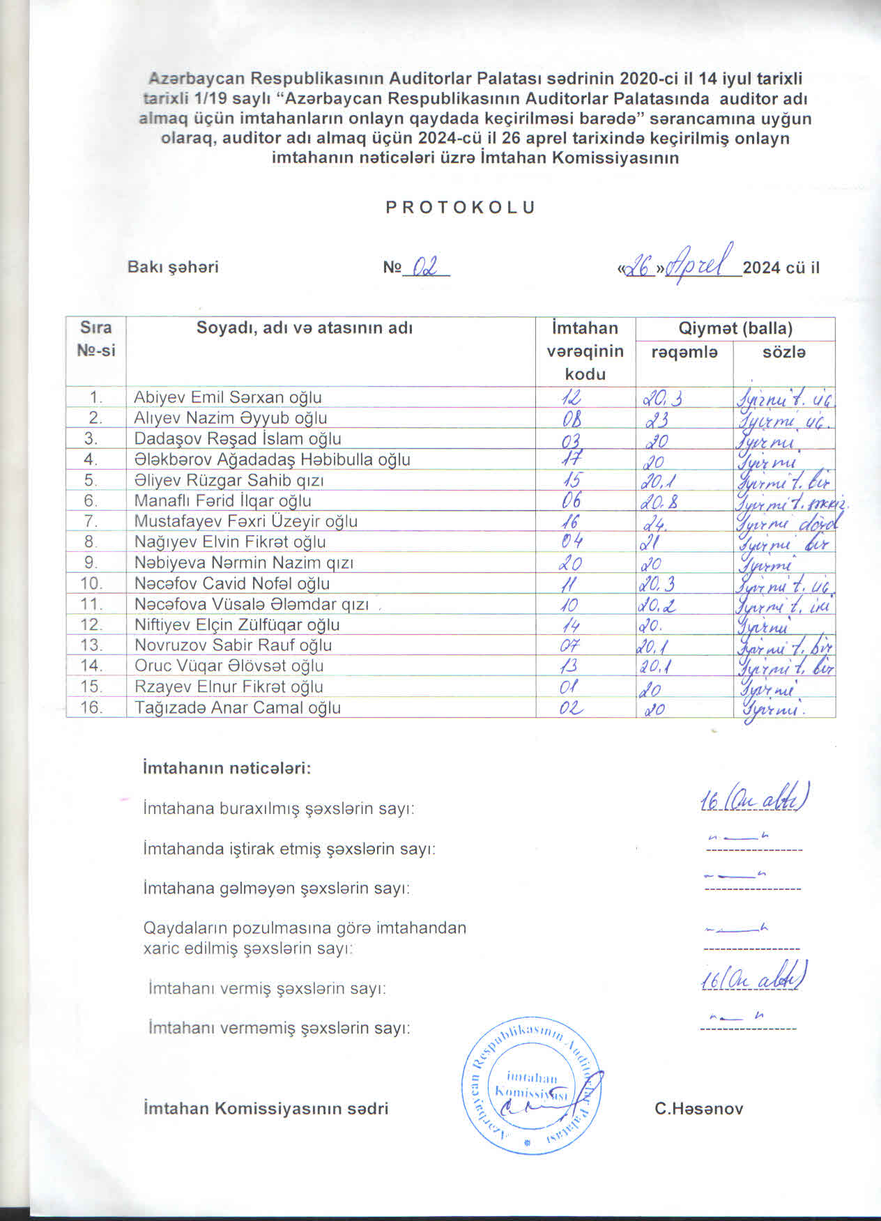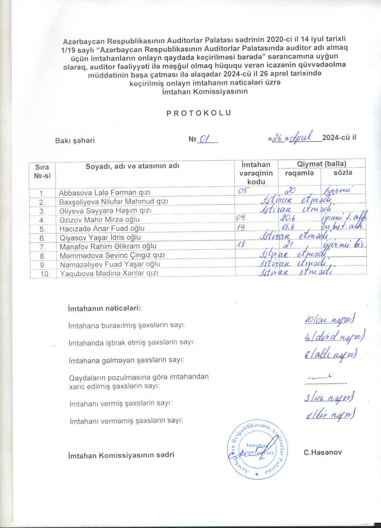 Azərbaycan Respublikası Auditorlar Palatası sədrinin 2020-ci il 14 iyul tarixli 1/19 saylı “Azərbaycan Respublikasının Auditorlar Palatasında auditor adı almaq üçün imtahanların onlayn qaydada keçirilməsi barədə” Sərəncamına uyğun olaraq, 2024-cü il 26 aprel tarixində auditor adı almaq üçün müraciət etmiş şəxslərə və bir qrup auditorlara auditor fəaliyyəti ilə məşğul olmaq üçün icazələrinin qüvvədəolma müddətinin başa çatması ilə əlaqədar onlayn imtahan keçirilmişdir. İmtahanın nəticələri barədə təsdiq edilmiş protokolları təqdim edirik: