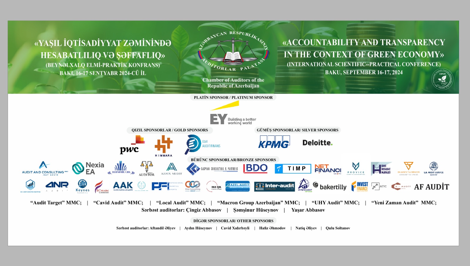 Ulu Öndər Heydər Əliyev tərəfindən “Auditor xidməti haqqında” Azərbaycan Respublikası Qanununun imzalanmasının 30 illiyi münasibətilə Auditorlar Palatası tərəfindən 2024-cü il 12-17 sentyabr tarixlərində keçirilmiş “Yaşıl iqtisadiyyat zəminində hesabatlılıq və şəffaflıq” mövzusunda beynəlxalq elmi-praktik konfransın təşkilinə göstərdiyiniz sponsorluğa görə konfransın Təşkilat Komitəsi adından Sizə dərin təşəkkürümüzü bildiririk.