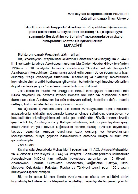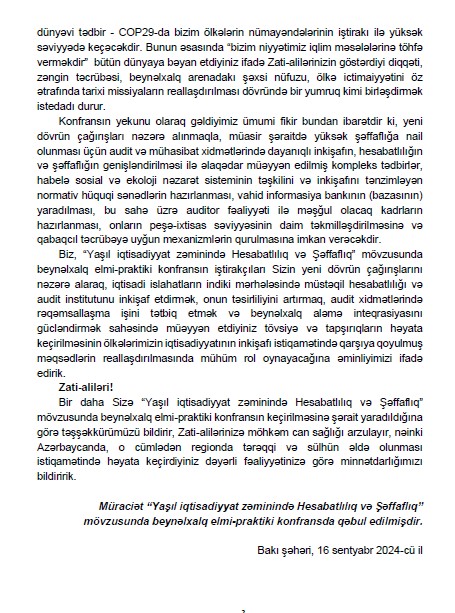 Bu baxımdan, 2024-cü il 16 sentyabr tarixində Ulu Öndər Heydər Əliyev tərəfindən “Auditor xidməti haqqında” Azərbaycan Respublikası Qanununun imzalanmasının 30 illiyi münasibətilə Auditorlar Palatası tərəfindən “Yaşıl iqtisadiyyat zəminində hesabatlılıq və şəffaflıq” mövzusunda təşkil olunmuş beynəlxalq elmi-praktik konfransda səsləndirilən fikirlər əsasında hazırlanacaq tövsiyələrin tətbiqi ölkələrimizdə dayanıqlı və yaşıl iqtisadiyyatın hesabatlılıq və şəffaflıqla bağlı bir sıra problemlərinin həllinə, bu istiqamətdə mühasiblərə və auditorlara vəzifələrinin daha ciddi yerinə yetirilməsinə öz müsbət töhfəsini vermiş olacaqdır