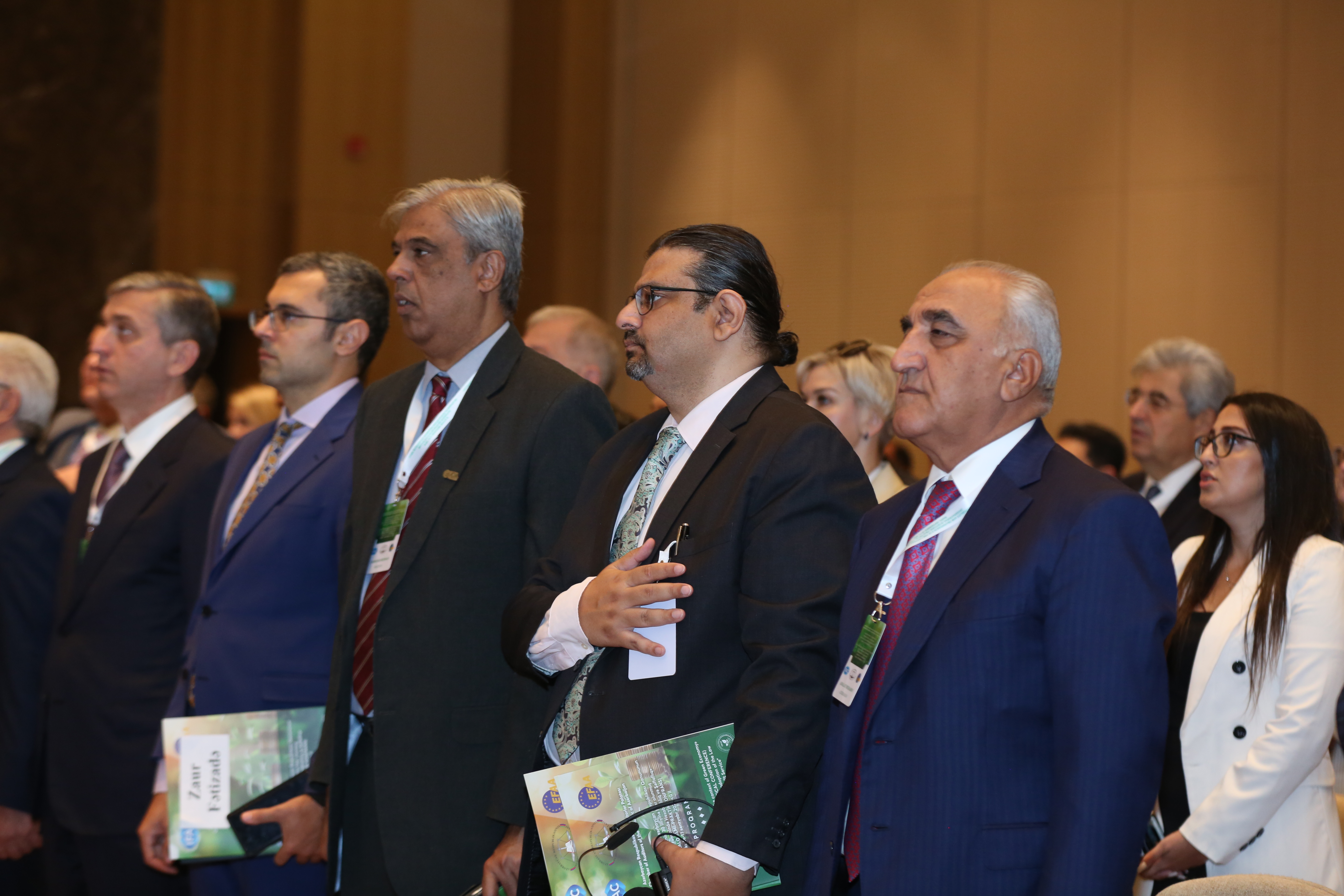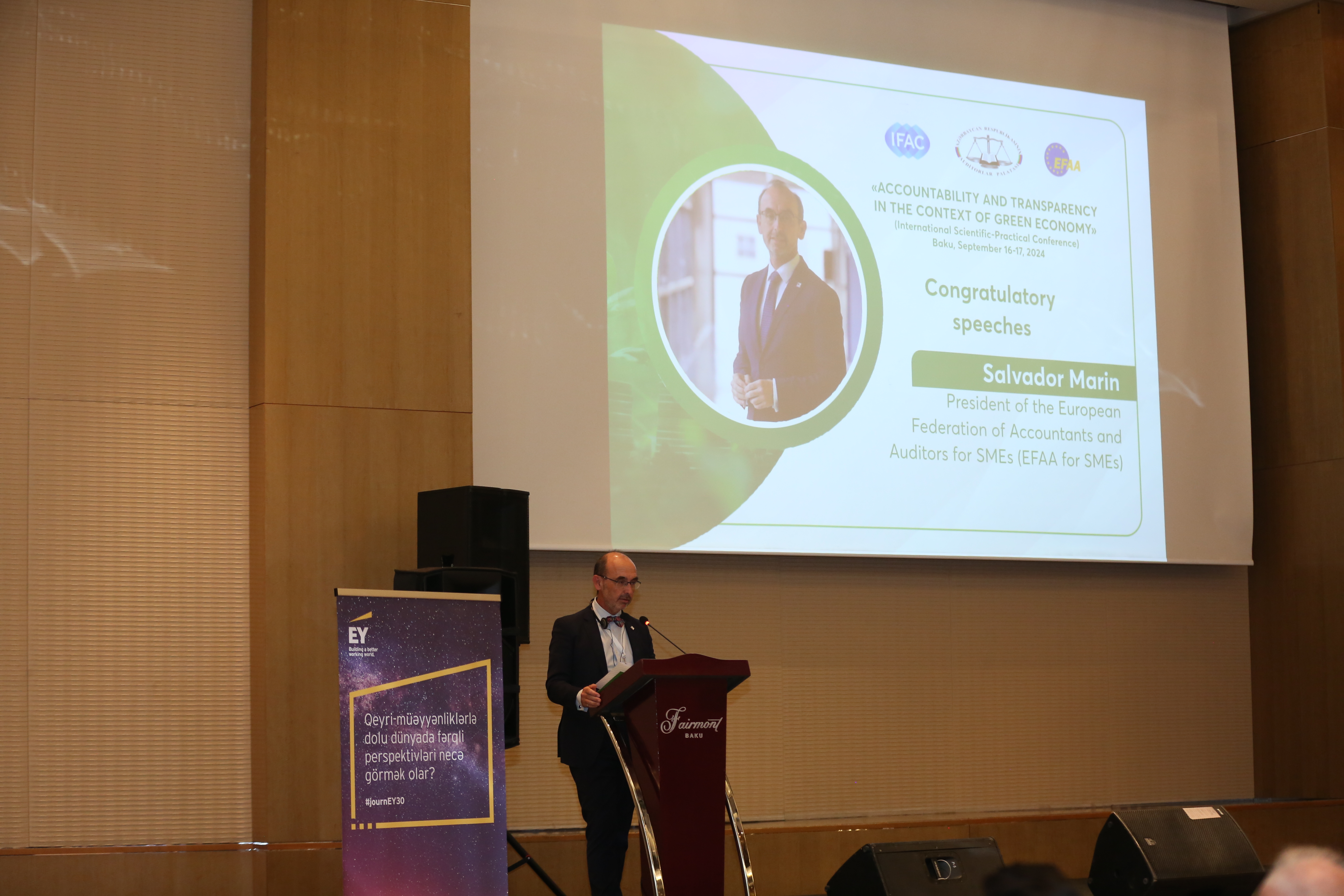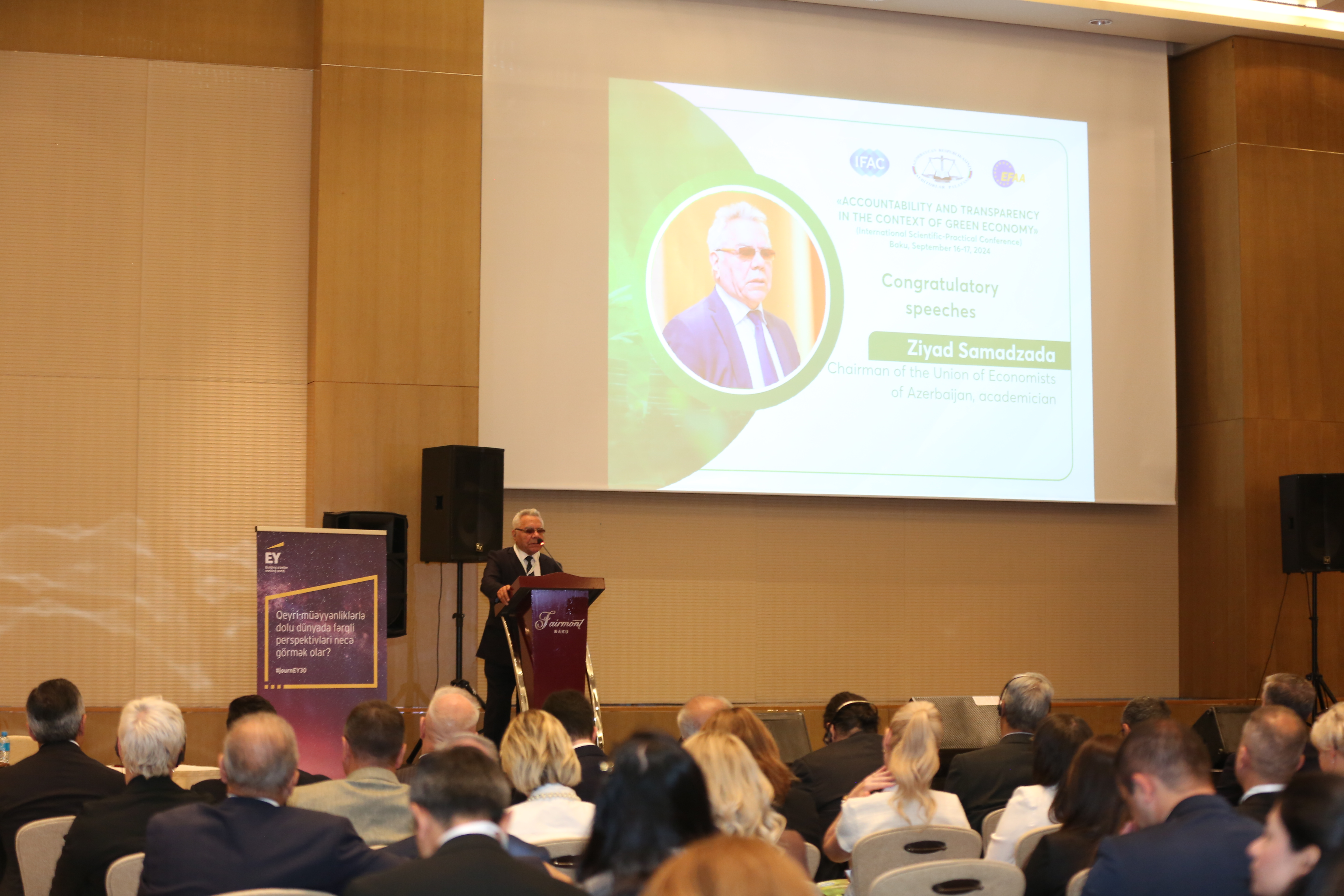 Eyni zamanda tədbirdə Azərbaycan Respublikası İqtisadiyyat nazirinin müavini Sahib Ələkbərov, Beynəlxalq Mühasiblər Federasiyasının (IFAC) prezidenti Asma Resmouki, Azərbaycan Respublikası Hesablama Palatasının sədri Vüqar Gülməmmədov, Azərbaycan İqtisadçılar İttifaqının sədri akademik Ziyad Səmədzadə, Avropa Mühasiblər və Auditorlar Federasiyasının (EFAA) prezidenti Salvador Marin və Azərbaycan Dövlət İqtisad Universitetinin (UNEC) rektoru Ədalət Muradov, Pakistanın İmtiyazlı Mühasiblər İnstitutunun (ICAP) prezidenti Farrux Rəhman, Rusiya Federasiyası “Sodrujestvo” Özünütənzimləyən Auditor Təşkilatları Assosiasiyasının İdarə heyətinin sədri İqor Kozırev, Qazaxıstan Respublikasının Auditorlar Palatası Şurasının sədri Sapar Koşkimbayev, Latviya Sertifikatlı Auditorlar Assosiasiyasının İdarə heyətinin üzvü, Təhsil komitəsinin sədri Sandra Vilcane, Özbəkistanın Milli Mühasiblər və Auditorlar Assosiasiyası Şurasının sədri Minovar Tulaxodjaeva, Litva Auditorlar Palatasının sabiq prezidenti İngrida Puriene, Özbəkistanın Auditorlar Palatası Şurasının sədri Nemətulla Kərimov, Gürcüstanın Auditorlar, Mühasiblər və Maliyyə Menecerləri Federasiyasının icraçı direktoru Yuri Papaskua, Rusiya Federasiyasının Uzaq Şərqin İnkişafı Nazirliyinin Hüquqi Təminat və Nəzarət Departamentinin direktoru Dmitriy Yakovenko və Moldova Peşəkar Mühasiblər və Auditorlar Assosiasiyasının sədri Jorjeta Kovaliov-Rusu təbrik nitqləri ilə çıxış ediblər.