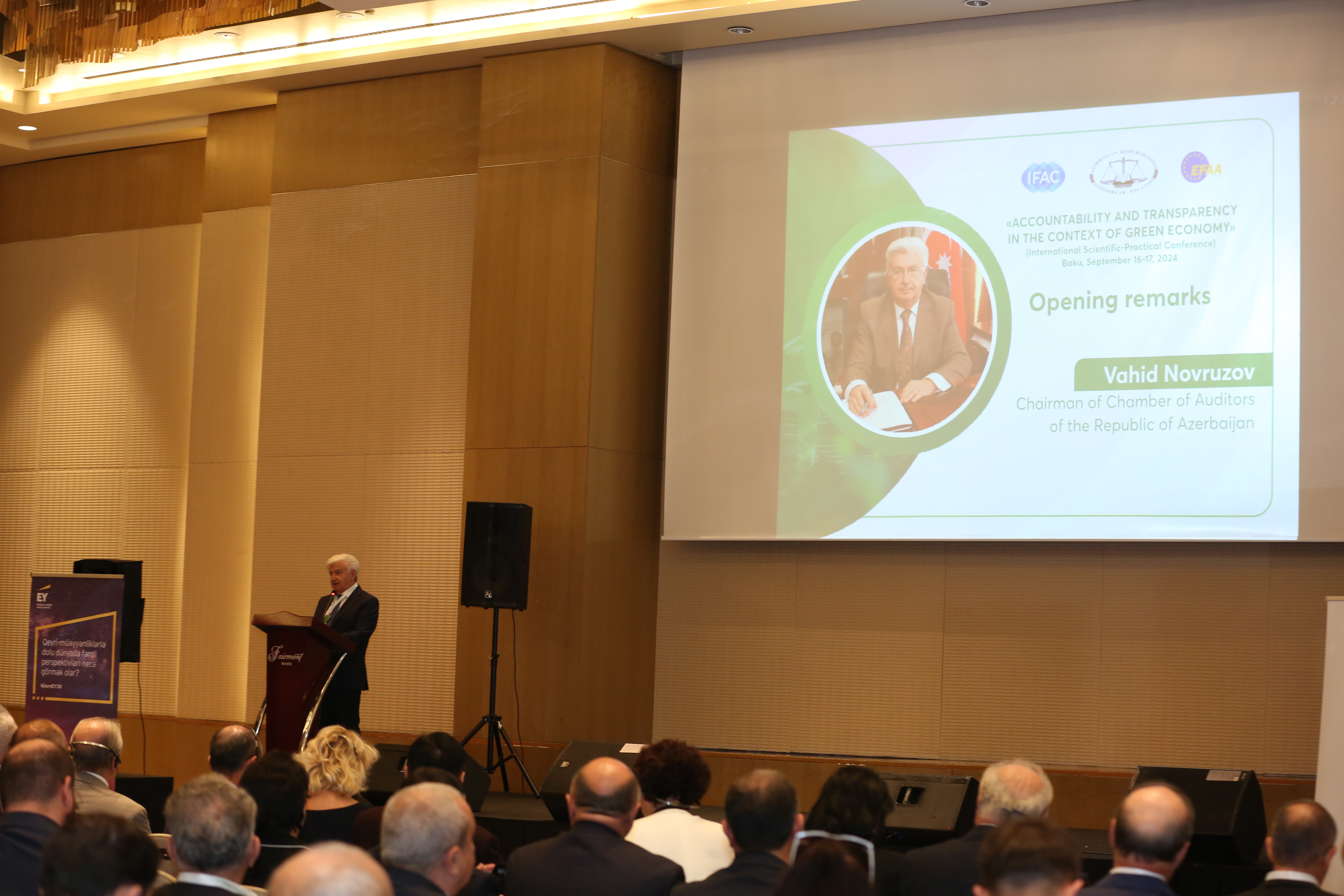 Beynəlxalq elmi-praktik konfransda Auditorlar Palatasının sədri, professor Vahid Novruzov konfransı açaraq qonaqları salamlayıb, konfransın əhəmiyyətindən bəhs edib və konfransın işinə uğurlar arzulayıb. Auditorlar Palatasının sədri, professor Vahid Novruzov tədbirin təşkilinə və göstərilən dəstəyə görə Azərbaycan Prezidenti İlham Əliyevə, Prezident Administrasiyasına təşəkkürünü bildirib: "Azərbaycan Respublikasında həyata keçirilən siyasi-iqtisadi islahatlar mühüm amillərdən biridir. Şəffaflığın artırılması Heydər Əliyevin dövlət quruculuğu siyasətində əsas yer tutub. 1993-cü ildə Azərbaycanda yenidən siyasi hakimiyyətə qayıdan ulu öndərin imzaladığı qanunlar və fərmanlarla ölkəmizdə şəffaflığın hüquqi bazası qoyulub. Ulu öndərin şəffaflıq siyasəti bir tərəfdən nəzarət edən qurumların sayının azalması və səlahiyyətlərinin məhdudlaşdırılmasına, sahibkarlığın genişləndirilməsinə, digər tərəfdən, müasir nəzarət institutlarına geniş yer verilməsinə, onların inkişafına nail olunmasına zəmin yaradıb. Nəzarət sisteminin təkmilləşdirilməsi və şəffaflığın yüksəldilməsi istiqamətində qanun 1994-cü il 16 sentyabr tarixində Heydər Əliyev tərəfindən imzalanıb".