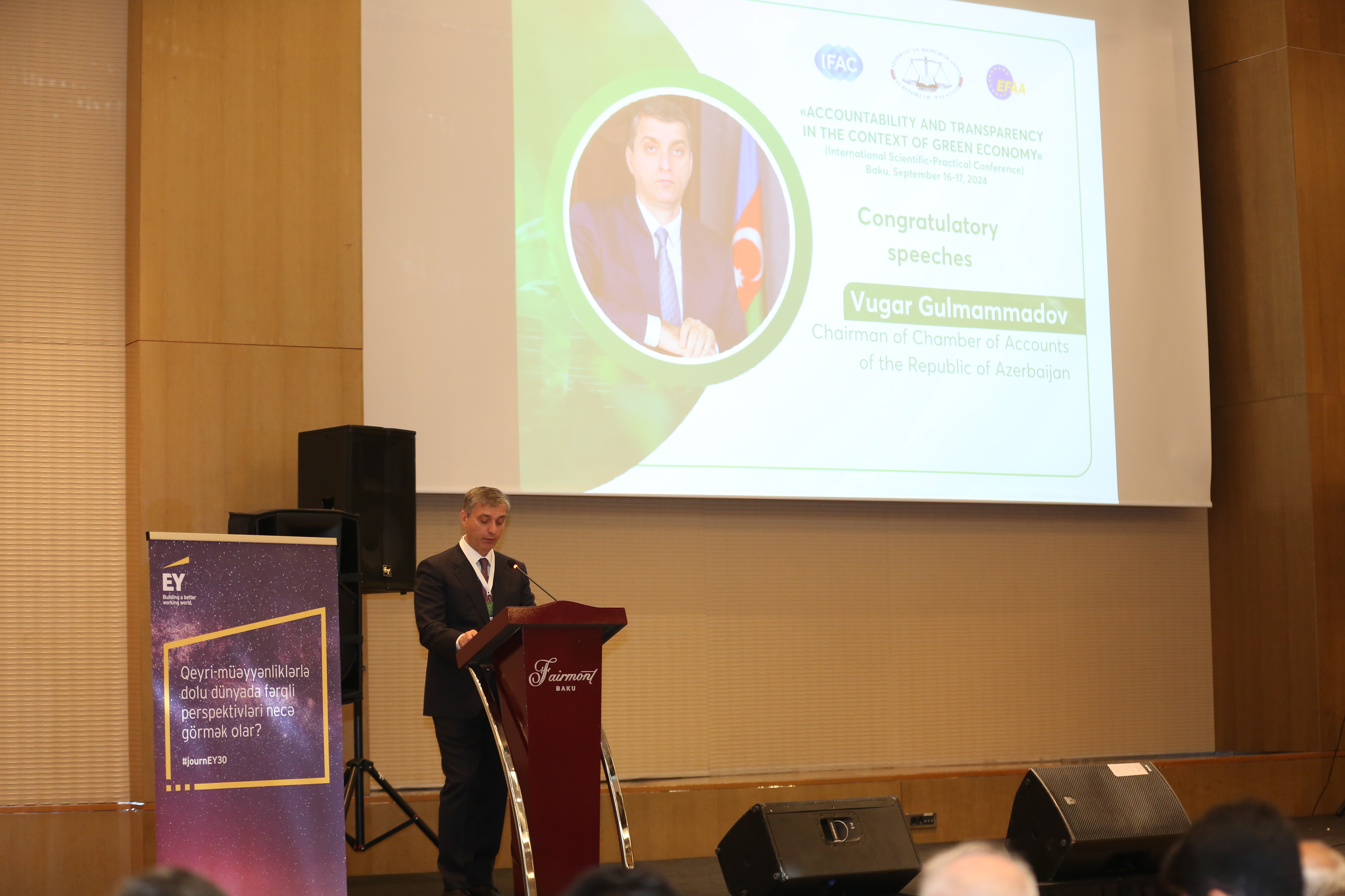 Konfransda çıxış edən Azərbaycan Respublikası İqtisadiyyat nazirinin müavini Sahib Ələkbərov qeyd edib ki, planetdə baş verən qlobal iqlim dəyişmələri və onun törətdiyi fəsadlar "yaşıl iqtisadiyyat"ın inkişafını zəruri edir: "Prezident İlham Əliyev tərəfindən təsdiq olunan 2022-2026-cı illəri əhatə edən sosial-iqtisadi inkişaf strategiyası ölkəmizdə "yaşıl iqtisadiyyat"a, yaşıl layihələrin icrası iqtisadi səmərəliliklə yanaşı, həm də texnoloji təhlükəsizliyin təminatına yönəlib. Təkrar emalın əhəmiyyəti getdikcə artmaqdadır. Bakı və ətraf qəsəbələrdə ekoloji vəziyyətin yaxşılaşdırılması istiqamətində ardıcıl tədbirlər görülür. İş adamlarının innovativ sahələrə meyli, "yaşıl texnologiya"lara olan marağı artır. Bu sahədə qabaqcıl beynəlxalq təcrübənin öyrənilməsi, karbon emissiyasının azaldılması məqsədilə vacib tədbirlər həyata keçirilir. Azərbaycan bərpaolunan enerji mənbələri üzrə yüksək potensiala malikdir. Həmin potensialdan istifadə sahəsində dövlət və özəl sektorun iştirakı ilə mühüm layihələr reallaşdırılır. Günəş, külək, su elektrik stansiyaları inşa olunur. Azad edilmiş torpaqlarımızın ölkə iqtisadiyyatına inteqrasiyası "yaşıl iqtisadiyyat"ın inkişafı sahəsində geniş imkanlar vəd edir. Bu baxımdan Qarabağ və Şərqi Zəngəzurun əhəmiyyəti çox böyükdür, xarici investorların da diqqətini məhz bu amil cəlb edir. Beynəlxalq Millətlər Təşkilatının müvafiq qurumlarının "yaşıl iqtisadiyyat" sahəsinin inkişafı üçün nəzərdə tutulan tədbirlər planı mövcuddur. Aydındır ki, yuxarıda qeyd olunanlar investisiya yatırımları olmadan mümkün deyil. İnvestisiya ayırmaları isə şəffaflığın və hesabatlılığın təmin olunmasını zəruri edir. Bu da audit orqanlarının fəaliyyətini qaçılmaz edir və şübhə yoxdur ki, Heydər Əliyevin 30 il əvvəl imzaladığı qanun Azərbaycan Respublikasında bu sahənin inkişafına öz töhfəsini verəcək. Bu məsələlər noyabr ayında Bakıda keçiriləcək COP29 iqlim konfransının əsas müzakirə mövzularından olacaq".