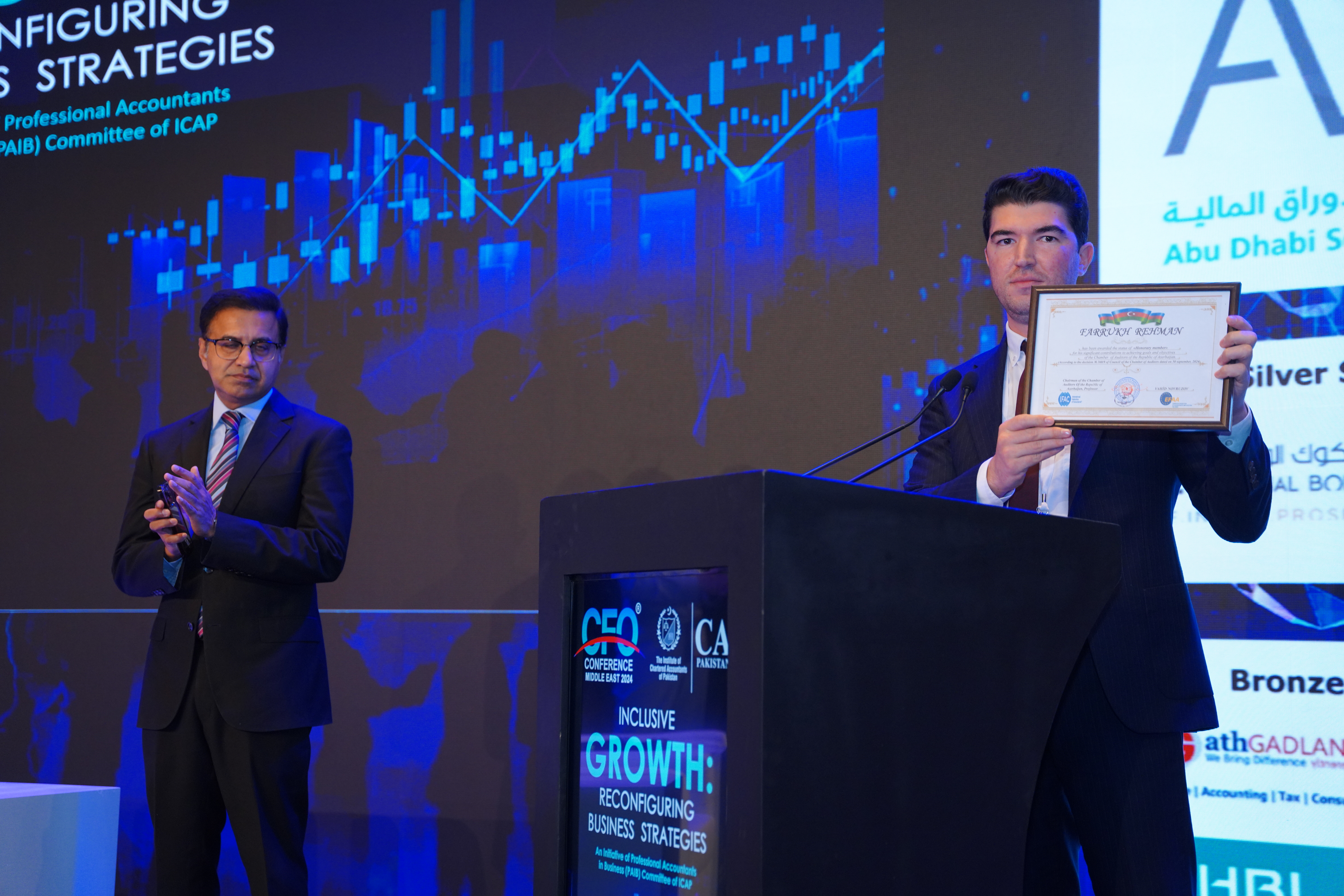Pakistanın İmtiyazlı Mühasiblər İnstitutunun (ICAP) prezidenti Fərrux Rəhmanın dəvətinə əsasən Azərbaycan Respublikası Auditorlar Palatasının sədri, professor Vahid Novruzovun rəhbərlik etdiyi nümayəndə heyəti ICAP tərəfindən Birləşmiş Ərəb Əmirliklərinin Dubay şəhərində oktyabrın 29-da keçirilmiş və Orta Şərqin aparıcı qlobal investisiya şirkətlərinin və ictimai əhəmiyyətli qurumlarının rəhbər şəxslərini və maliyyə direktorlarını bir araya gətirən “İnklüziv inkişaf: biznes strategiyalarının rekonfiqurasiyası” mövzusunda beynəlxalq konfransda iştirak edib.