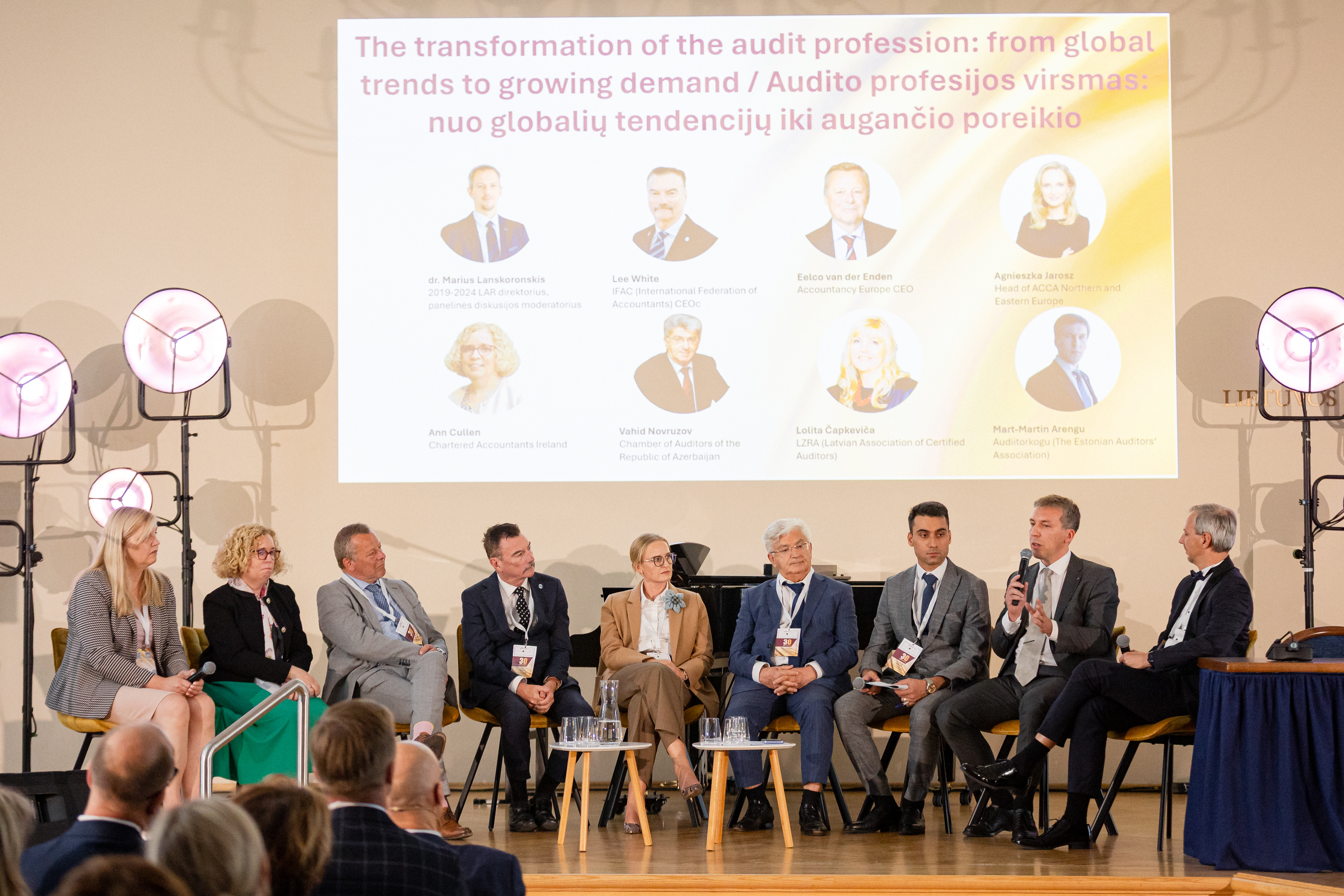 Tədbirdə Litva Respublikası prezidentinin nümayəndəsi, Maliyyə naziri, Daxili İşlər Nazirliyi yanında Maliyyə Cinayətlərinin İstintaq Xidmətinin və digər müvafiq nazirliklərin rəhbərləri, Hesablama Palatasının sədri, Beynəlxalq Mühasiblər Federasiyasının (IFAC) və Avropa Mühasibləri Təşkilatının Baş icraçı direktorları, İmtiyazlı Sertifikatlaşdırılmış Mühasiblər Assosiasiyasının (ACCA) Şimali və Şərqi Avropa üzrə regional rəhbəri, Litva Auditorlar Palatasının prezidenti və sabiq prezidentləri, habelə Estoniya, İrlandiya və Latviyanın audit və mühasibatlıq qurumlarının nümayəndələri tərəfindən “Litva Auditorlar Palatası tərəfindən ötən illər ərzində auditin təşkili və tənzimlənməsi”, “30 illik etimad: transformasiyada naviqasiya, gələcək baxışlar”, “Maliyyə hesabatlılığının şəffaflığının və keyfiyyətinin təmin edilməsində müstəqil auditin rolu”, “Avropa İttifaqının korporativ sektor üçün yaşıl və rəqəmsal siyasəti”; “Maliyyə və dayanıqlılıq hesabatına dair islahatların yaratdığı imkanlar”, “Dövlət və korporativ sektor üzrə dayanıqlılıq hesabatı”; “Süni intellekt – mühasibatlıq və audit üçün risklər və imkanlar”, “Cinayət gəlirlərinin leqallaşdırılmasına qarşı mübarizədə auditorların rolu”, “Auditor fəaliyyəti üzərində dövlət nəzarəti” mövzularında məruzələr dinlənilib.