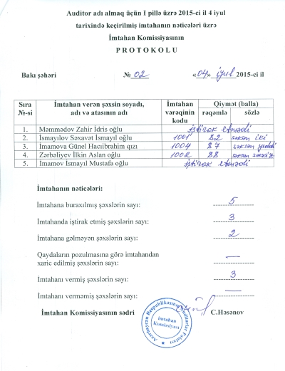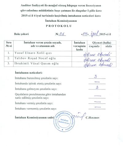 2015-ci il 04 iyul tarixində auditor fəaliyyəti ilə məşqul olmaq hüququ verən lisenziyanın qüvvədəolma müddətinin başa çatması və auditor adı almaq üçün I pillə üzrə keçirilmiş imtahanın nəticələri üzrə İmtahan Komissiyasının