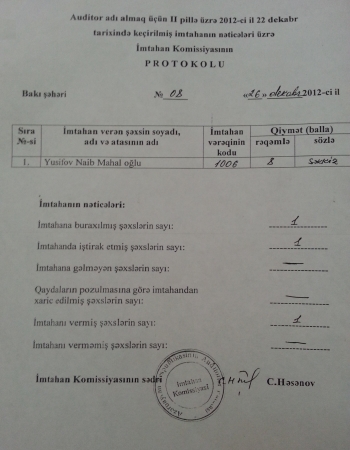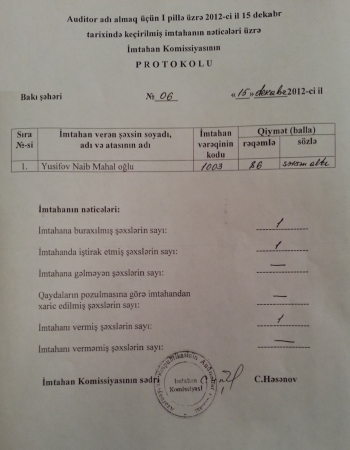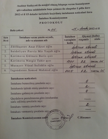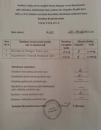 Bir qrup auditorlara, auditor fəaliyyəti ilə məşğul olmaq hüququ verən lisenziyanın qüvvədəolma müddətinin başa çatması və yeni auditor adı almaq üçün müraciət etmiş şəxslərə II pillə üzrə 2012-ci ilin 22 dekabr tarixində keçirilmiş imtahanın nəticələri üzrə İmtahan Komissiyasının