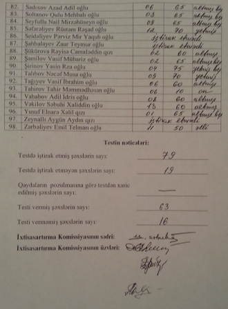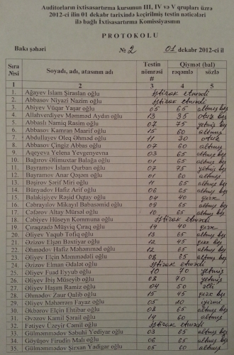 Auditorların ixtisasartırma kursunun III, IV və V qrupları üzrə 2012-ci ilin 1 dekabr tarixində imtahan keçirilmiş testin nəticələri ilə bağlı İxtisasartırma Komissiyasının
