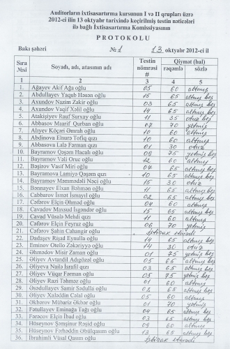 Auditorların ixtisasartırma kursunun I və II qrupları üzrə 2012-ci ilin 13 oktyabr tarixində imtahan keçirilmiş testin nəticələri ilə bağlı İxtisasartırma Komissiyasının