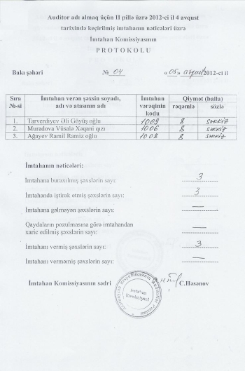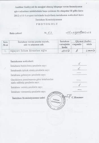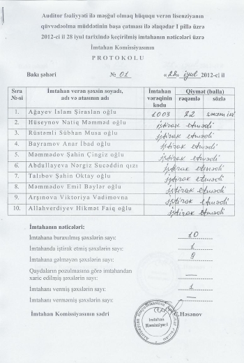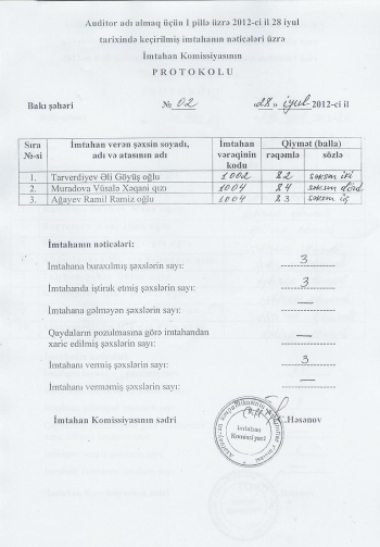 Bir qrup auditorlara, auditor fəaliyyəti ilə məşğul olmaq hüququ verən lisenziyanın qüvvədəolma müddətinin başa çatması və yeni auditor adı almaq üçün müraciət etmiş şəxslərə I pillə üzrə 2012-ci ilin 28 iyul tarixində keçirilmiş imtahanın nəticələri üzrə İmtahan Komissiyasının
