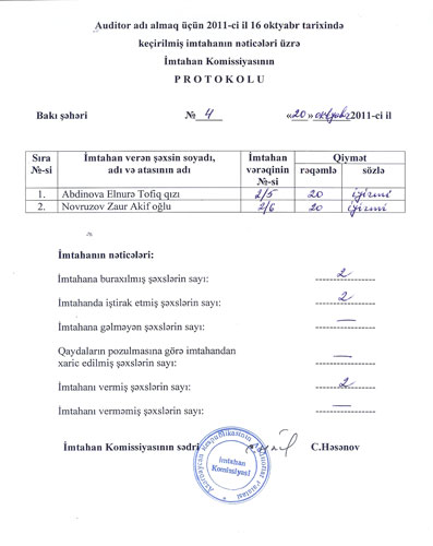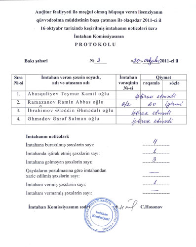Auditor adı almaq üçün 2011-ci ilin 16 oktyabr tarixində keçirilmiş imtahanın nəticələri üzrə İmtahan Komissiyasının
