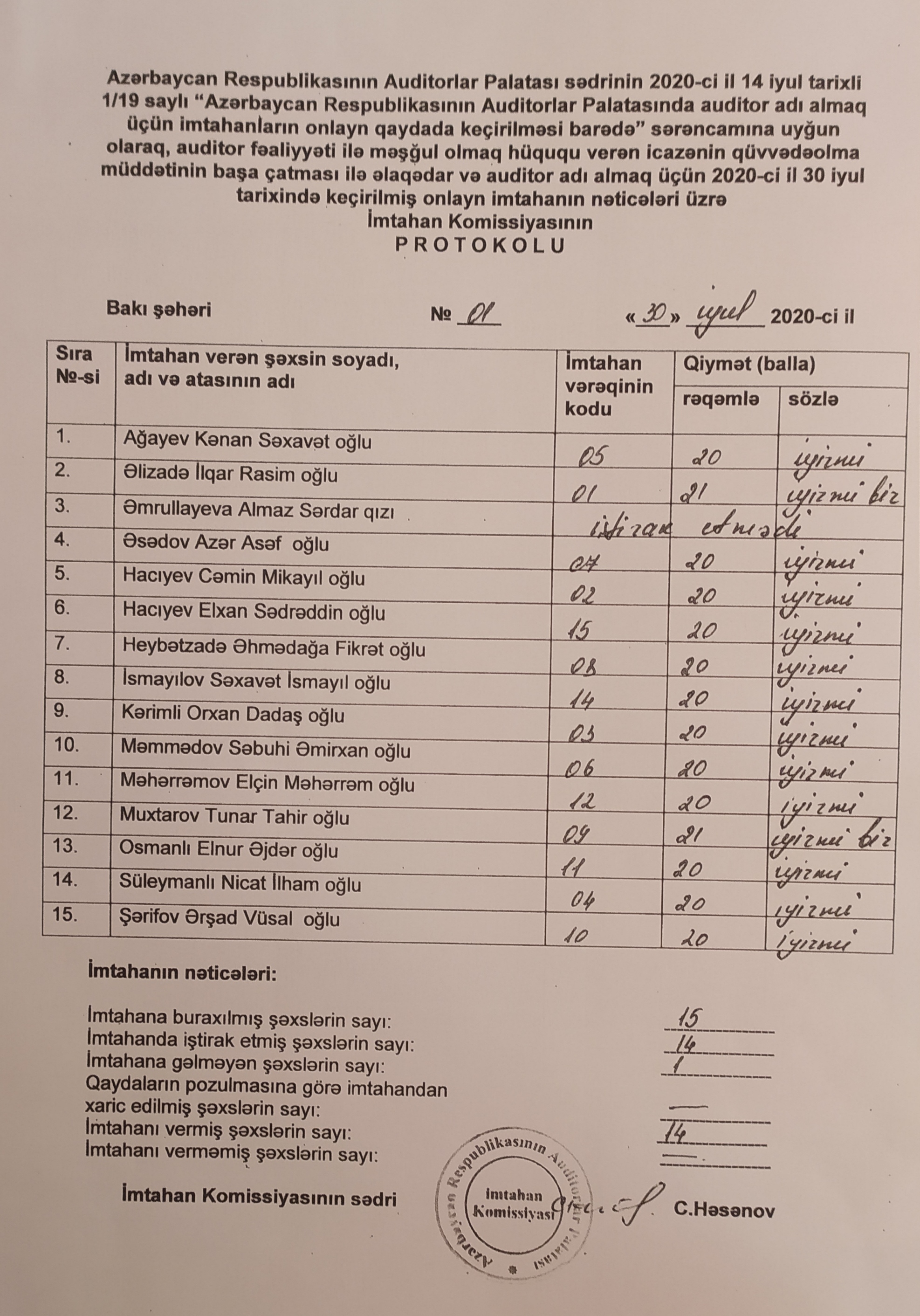 Azərbaycan Respublikası Auditorlar Palatası sədrinin 2020-ci il 14 iyul tarixli 1/19 saylı “Azərbaycan Respublikasının Auditorlar Palatasında auditor adı almaq üçün imtahanların onlayn qaydada keçirilməsi barədə” Sərəncamına uyğun olaraq, 2020-ci 30 iyul tarixində auditor adı almaq üçün müraciət etmiş şəxslərə və bir qrup auditorlara auditor fəaliyyəti ilə məşğul olmaq üçün icazələrinin qüvvədəolma müddətinin başa çatması ilə əlaqədar onlayn şifahi imtahan keçirilmişdir. İmtahanda ümumi 14 nəfər iştirak etmiş və müvəffəq bal toplamışdır.