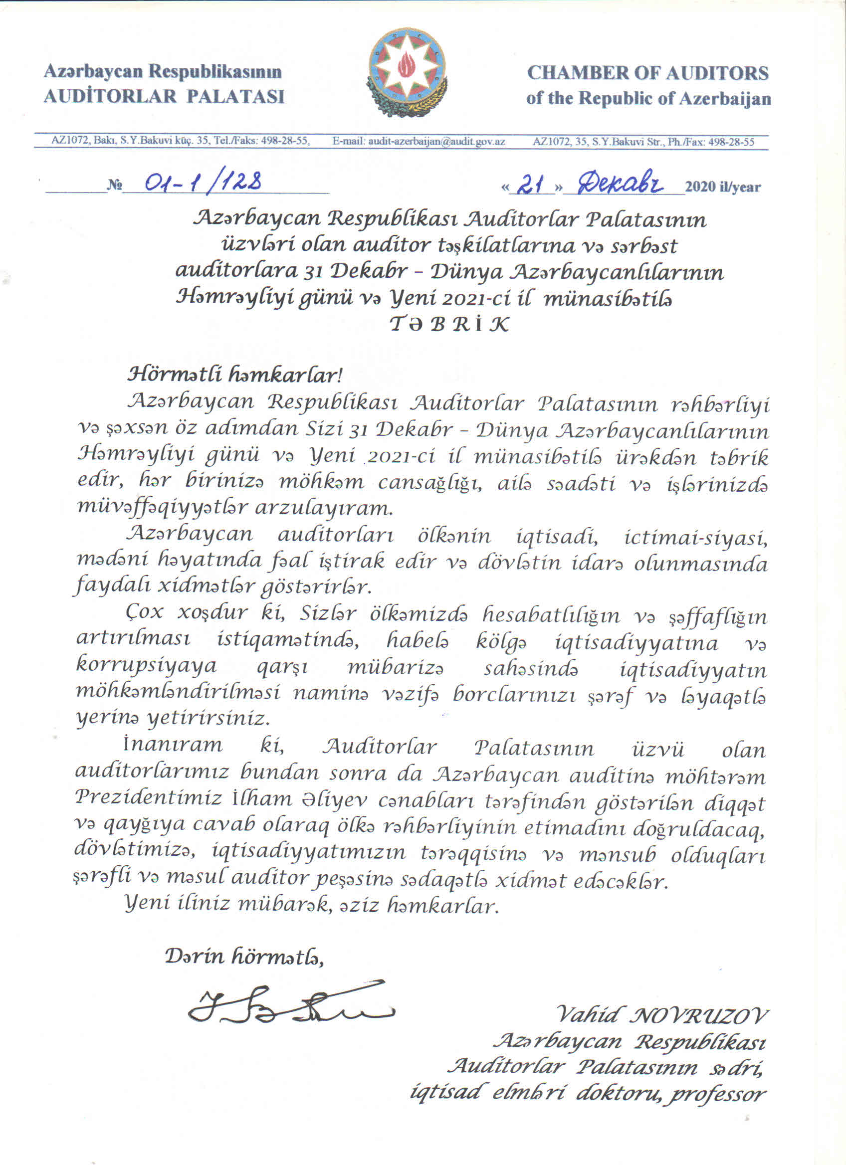 Azərbaycan Respublikası Auditorlar Palatasının üzvləri olan auditor təşkilatları və sərbəst auditorları 31 dekabr-Dünya Azərbaycanlıların Həmrəyliyi günü münasibətilə təbrik edirik