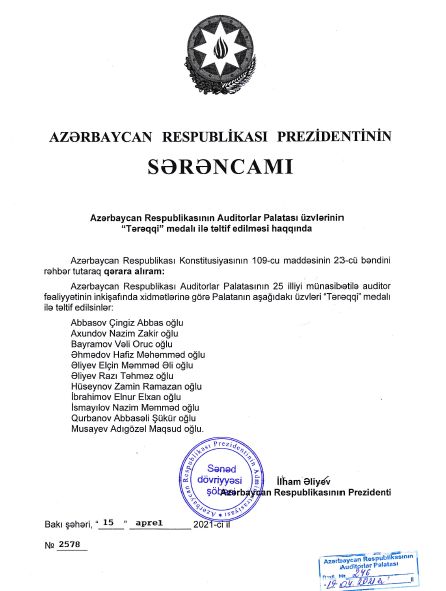 Azərbaycan Respublikası Auditorlar Palatasının bir qrup əməkdaşları və üzvləri “Tərəqqi” medalı ilə təltif edilmişlər.